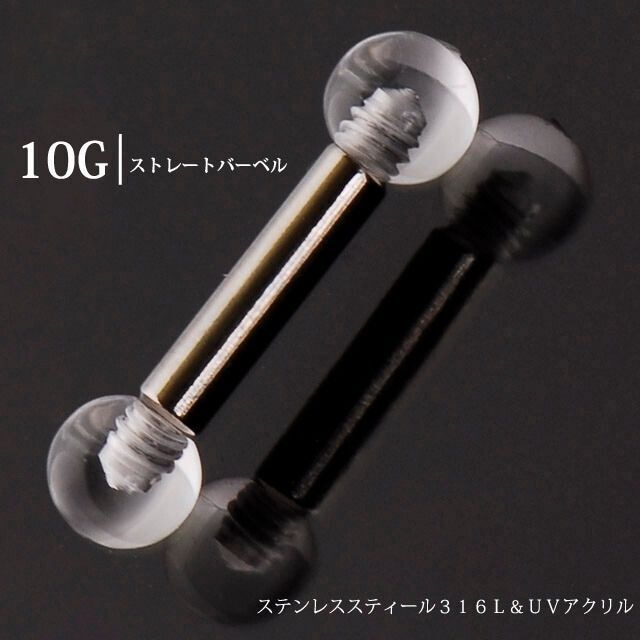 【素材】 ・サージカルステンレス 316L ・UVアクリルボール 【サイズ】 ・ゲージサイズ10G ・シャフトサイズ選べます ・ボールサイズ選べます 【特徴】 ・学生さんやお仕事、冠婚葬祭などで透明ピアスを付けなくてはいけない時に便利なのがこのアイテム。シャフト部分はホールで隠れるので見える部分は透明の目立ちにくいボールのみ。シャフトはステンレス製なのでお肌にも優しくネジ部分も強いので長くお使い頂けます。たまに、透明ボールを外してお手持ちの14G用のキャッチを付ける事も出来ますょ(※メーカーによりはまらないものあり)。※透明ボールはアルコール消毒すると割れますので絶対使用しないで下さい。また、画像では10mmは今現在10.5mmサイズになります。 【注意】 ・写真はできる限り現品を再現するよう心がけておりますが、お客様のモニター環境に より商品のイメージと異なる場合がございます。ご了承ください。 ※1個売りです。