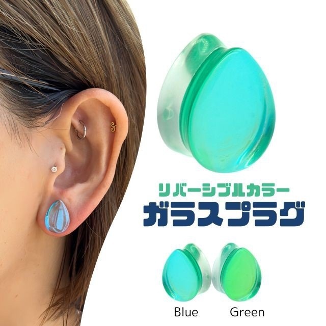 【素材】 ・ガラス 【サイズ】 ・ゲージサイズ00G(全長サイズ約12.7mm・内径サイズ約7mm) ・ゲージサイズ12mm(全長サイズ約12.4mm・内径サイズ約7mm) 【特徴】 ・まるで水滴のような透明感と、角度によって表情を変えるダブルカラーが魅力のリバーシブルガラスプラグ。 ブルーとグリーン、どちらの色を表にするかはあなた次第。ひとつで2通りの楽しみ方ができる、存在感抜群のボディピアスです。 ※キャッチが無いダブルフレアピアスです、フレア部分はゲージサイズより約1.5mm程大きいです。ホールに隙間がない方や伸びにくい方は1ゲージ下のサイズをお勧めします。慣れれば、着脱も楽々&見た目もスマートで、カジュアルにもドレッシーにも合わせられる万能プラグです。光が当たるとより綺麗で、周りに褒められますよ。 【注意】 ・写真はできる限り現品を再現するよう心がけておりますが、お客様のモニター環境に より商品のイメージと異なる場合がございます。ご了承ください。 ※1個売りです。