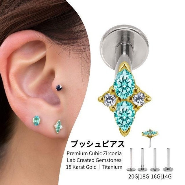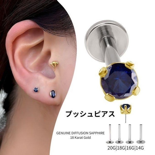 18K 18金ゴールド プッシュピアス 20G 18G 16G 14G ディフュージョン・ブルーサファイア チタンピアス ラブレットスタッド ボディピアス