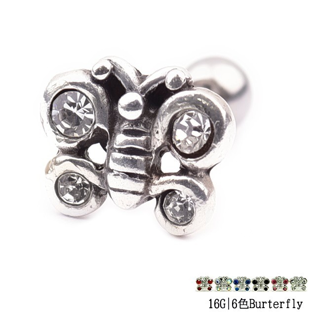 バタフライピアス 16G 全6色 ストーンピアス 蝶々 ストレートピアス ステンレスピアス イヤーロブ 軟骨ピアス ボディピアス