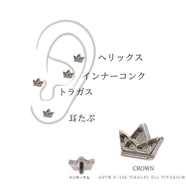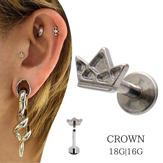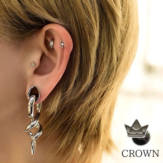 ・人気の王冠デザインピアスは、くり抜いたようなデザインなので立体的にも見えオススメです。 素材はALL医療用タイタニアム(チタン)でお肌に優しく相当なアレルギーでない限り安心してお使い頂けます。 つけっぱなしOKでロブ へリックス トラガス インナーコンク アウターコンク 軟骨ピアス等にオススメです。※別売りのツールがあると不器用な方や入れにくい部位でもスムーズにホールに入りオススメです。 ※ロブや軟骨の平均シャフトサイズは4mm~6mmです。あくまでも平均サイズなので参考にして下さい。