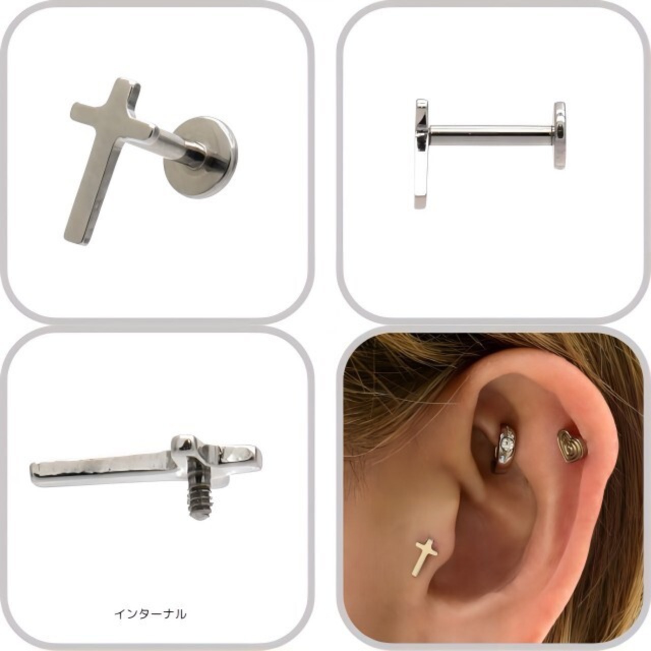 トラガスピアス 金属アレルギー対応 18G 16G クロス 十字架ピアス つけっぱなし チタン素材 インターナル ラブレットスタッド ボディピアス ロブ 軟骨ピアス