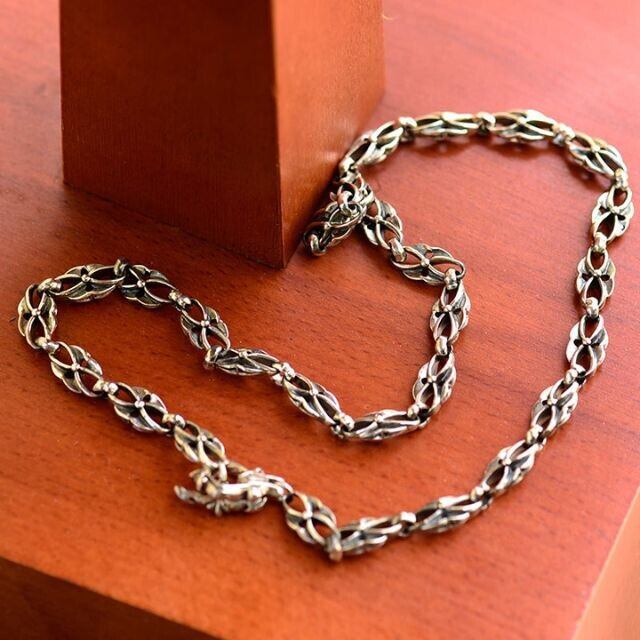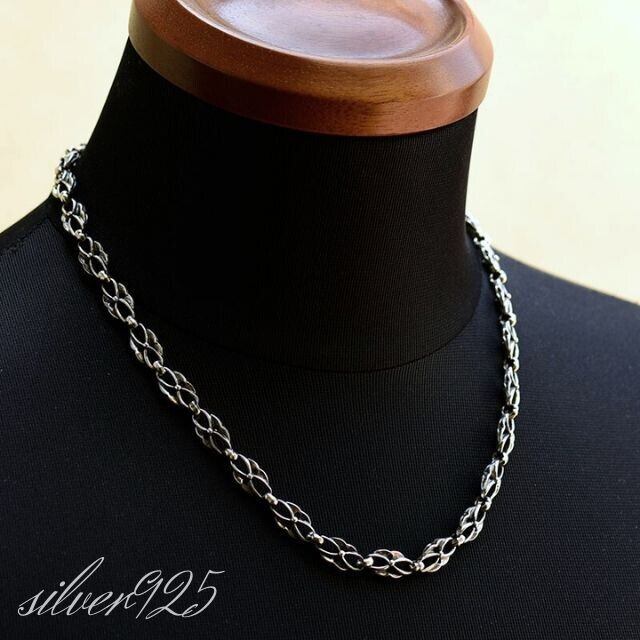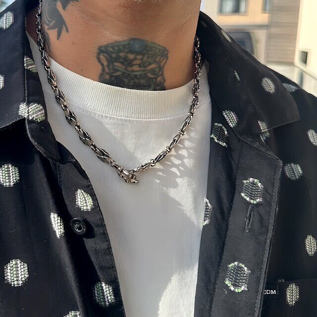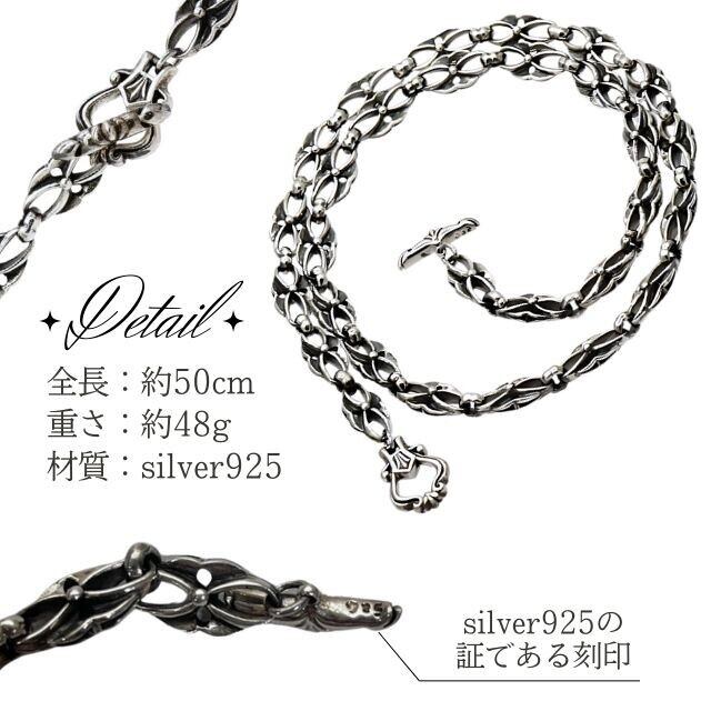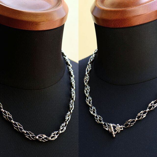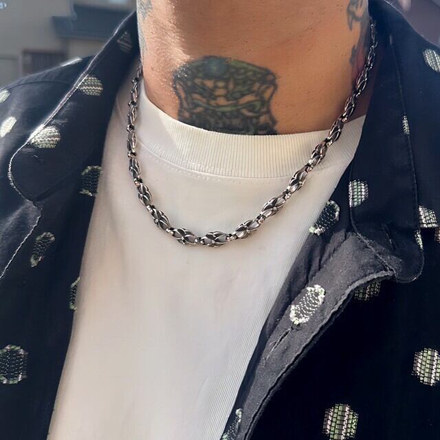 50センチのネックレスは、首元にややゆとりのあるミドルレングスです。首にフィットしすぎず、デコルテを少し下に囲むような上品な印象です。デザインが細かく立体的で、彫金細工のような存在感あり、シンプルなトップスに合わせると、シルバーの輝きが際立ってスタイリッシュに決まります。