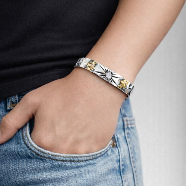 中央には放射状のサンバースト彫刻とともに、煌めくストーンを配置。輝きが手元を華やかに演出します。