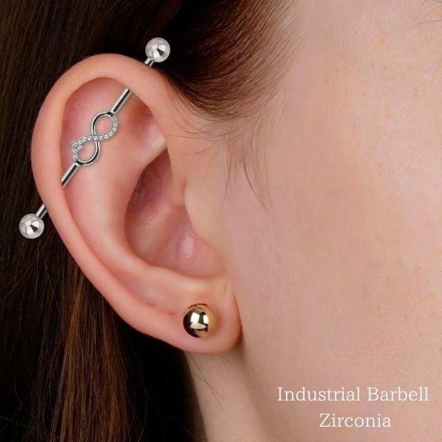 ・永遠や無限の象徴「インフィニティ」デザインを中央にあしらった、スタイリッシュなインダストリアルバーベルピアス。モチーフにはキュービックジルコニアが埋め込まれており、繊細な輝きが特徴です。耳の軟骨に2か所あけたホールに通して装着するスタイルで、個性と美しさを両立したアクセサリーです。