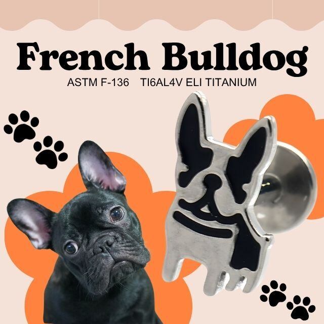 ・キュートなフレンチブルドッグモチーフが目を引く、エナメル仕上げのピアスです。素材は医療用グレードのASTM F-136 TI6AL4V ELIチタンを使用しており、金属アレルギーを起こしにくく安心してご使用いただけます。