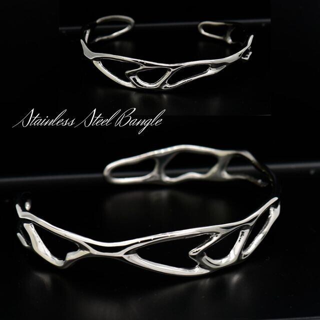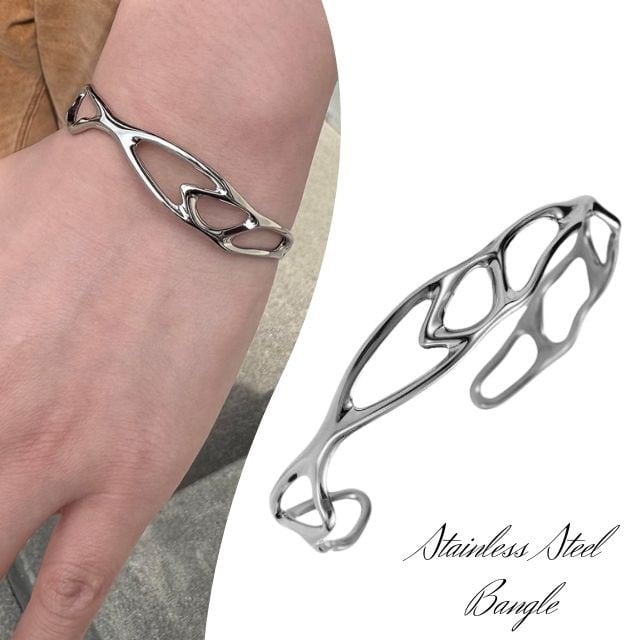 ・流線的で個性的なオープンデザインが目を惹く、ステンレス素材のバングルです。光沢感のあるメタリックな質感がクールで、ユニセックスで使いやすい一本です。