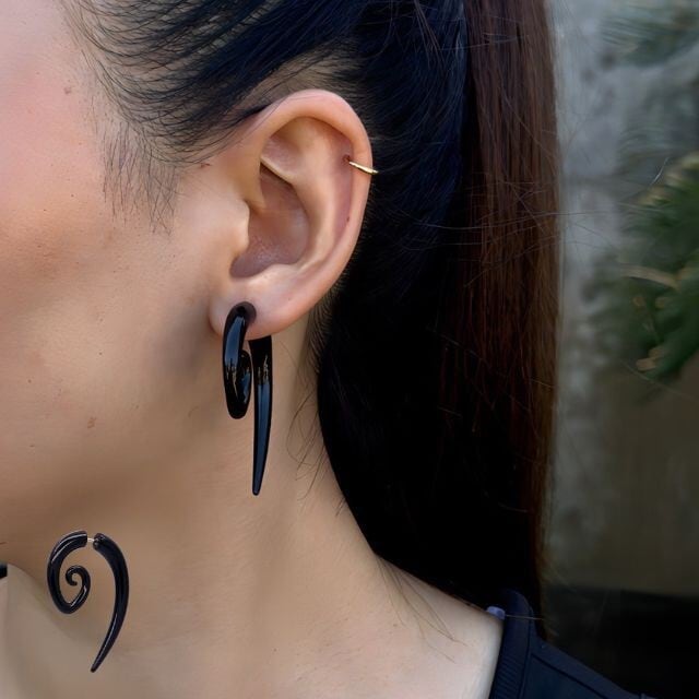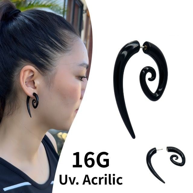 シャフト部分はステンレス製で、ネジ式の着脱タイプでしっかり固定できて安心です。実際は16G(約1.2mm)のシャフトサイズで、2Gサイズの拡張ピアスを着けているように見えます。シャフトが見えにくい構造になっており、より自然な着け心地とビジュアルを演出します。