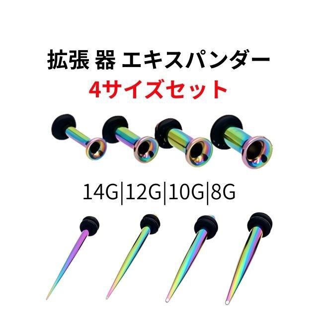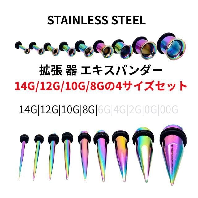 テーパーとシングルフレアのセットで、ピアスホールの拡張をスムーズに、そしておしゃれにサポートします。セット内容:・14G(約1.6mm)・12G(約2mm)・10G(約2.5mm)・8G(約3.2mm)各サイズ、テーパー+シングルフレアの2点セット(合計8点)ステンレス製で丈夫でお得な4サイズ入り。ゴム付きでしっかり固定出来ます。初心者さんにもおすすめのスターターセットです!
