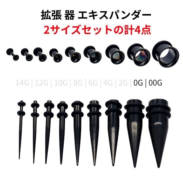テーパーとシングルフレアのセットで、ピアスホールの拡張をスムーズに、そしておしゃれにサポートします。セット内容:・0G(約8mm)・00G(約10mm)各サイズ、テーパー+シングルフレアの2点セット(合計4点)ステンレス製で丈夫でお得な2サイズ入り。ゴム付きでしっかり固定出来ます。初心者さんにもおすすめのスターターセットです!