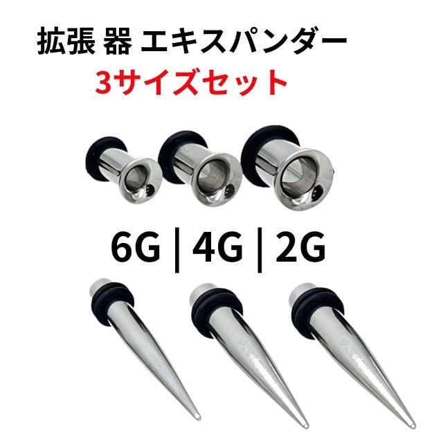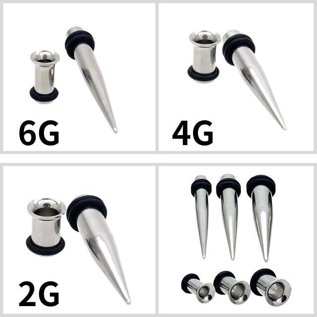 テーパーとシングルフレアのセットで、ピアスホールの拡張をスムーズに、そしておしゃれにサポートします。セット内容:・6G(約4mm)・4G(約5mm)・2G(約6mm)各サイズ、テーパー+シングルフレアの2点セット(合計6点)ステンレス製で丈夫でお得な3サイズ入り。ゴム付きでしっかり固定出来ます。初心者さんにもおすすめのスターターセットです!