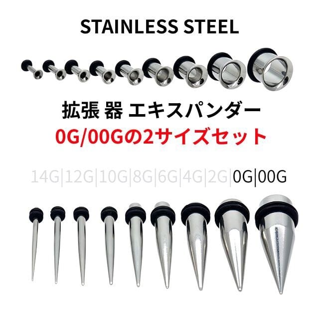 テーパーとシングルフレアのセットで、ピアスホールの拡張をスムーズに、そしておしゃれにサポートします。セット内容:・0G(約8mm)・00G(約10mm)各サイズ、テーパー+シングルフレアの2点セット(合計4点)ステンレス製で丈夫でお得な2サイズ入り。ゴム付きでしっかり固定出来ます。初心者さんにもおすすめのスターターセットです!