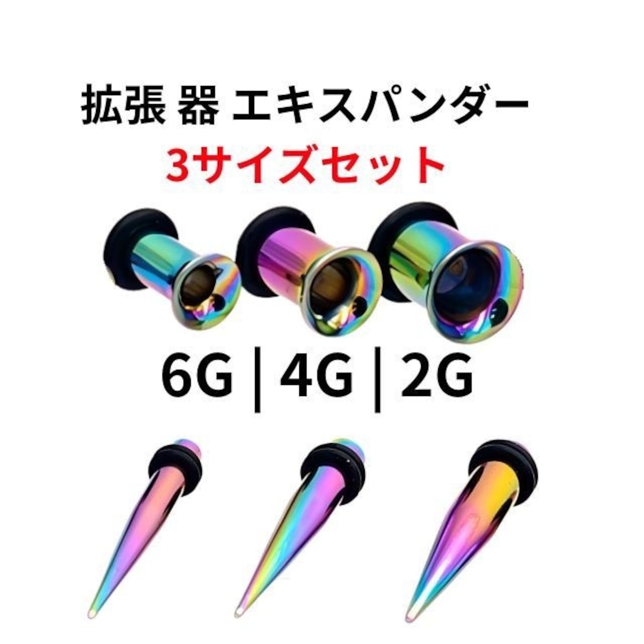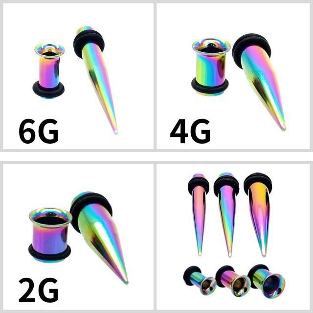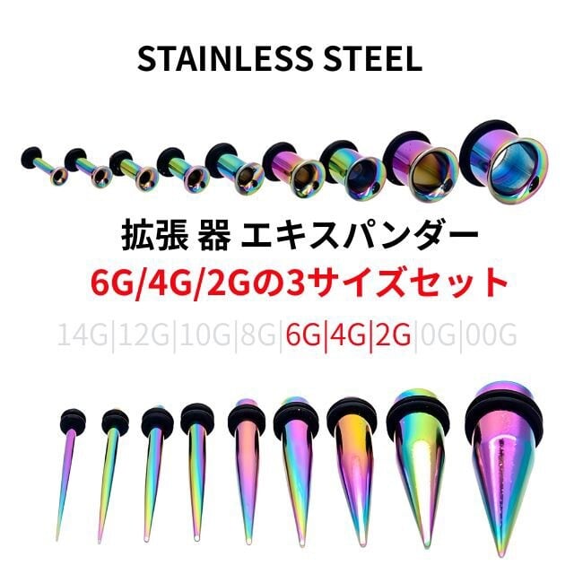 テーパーとシングルフレアのセットで、ピアスホールの拡張をスムーズに、そしておしゃれにサポートします。セット内容:・6G(約4mm)・4G(約5mm)・2G(約6mm)各サイズ、テーパー+シングルフレアの2点セット(合計6点)ステンレス製で丈夫でお得な3サイズ入り。ゴム付きでしっかり固定出来ます。初心者さんにもおすすめのスターターセットです!