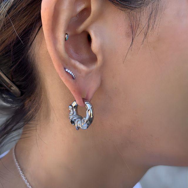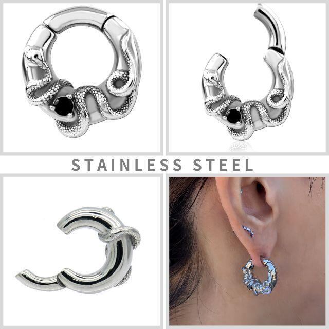 ・巻きつくようなリアルなスネークモチーフに、ブラックジルコニアがきらりと光る存在感抜群のピアスです。クール・ミステリアス・個性派スタイルを求める方にぴったり。耳たぶはもちろん、ホールサイズや位置によっては軟骨にも着けれます。