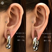 ステンレスリングだと重くて勝手に拡張されてしまいますが、チタンは丈夫で軽いので着けっぱなしにしていてもホールに負担がかかりにくくオススメです。しかもキャッチはインターナルタイプなので道具がなくても簡単にキャッチが着けれます。※下部画像は、ステンレスとチタンを着けた時のホールの伸びを再現してます、参考にして下さい。