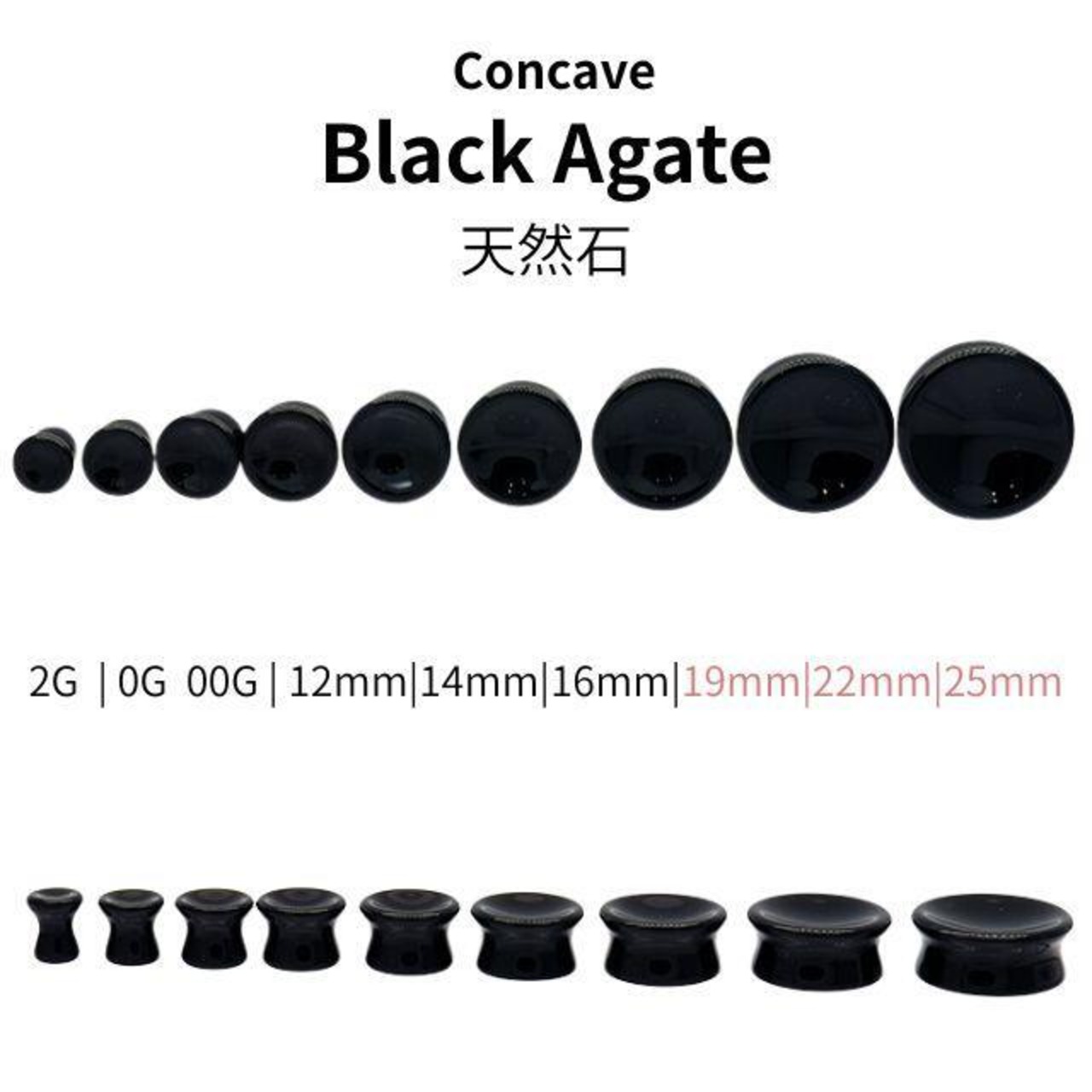 天然石 ブラックアゲート 19mm 22mm 25mm コンケーブプラグ ロブ 軟骨ピアス ボディピアス 拡張ピアス