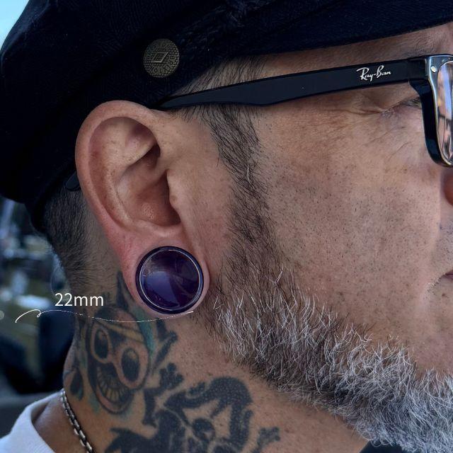 ・高貴な紫色が魅力のアメジスト天然石プラグピアスです。表面は緩やかな凹型(コンケーブ)で立体感のあるデザインに。透明感のある艶やかな質感と、ストーンならではのひんやりとした装着感が特徴です。