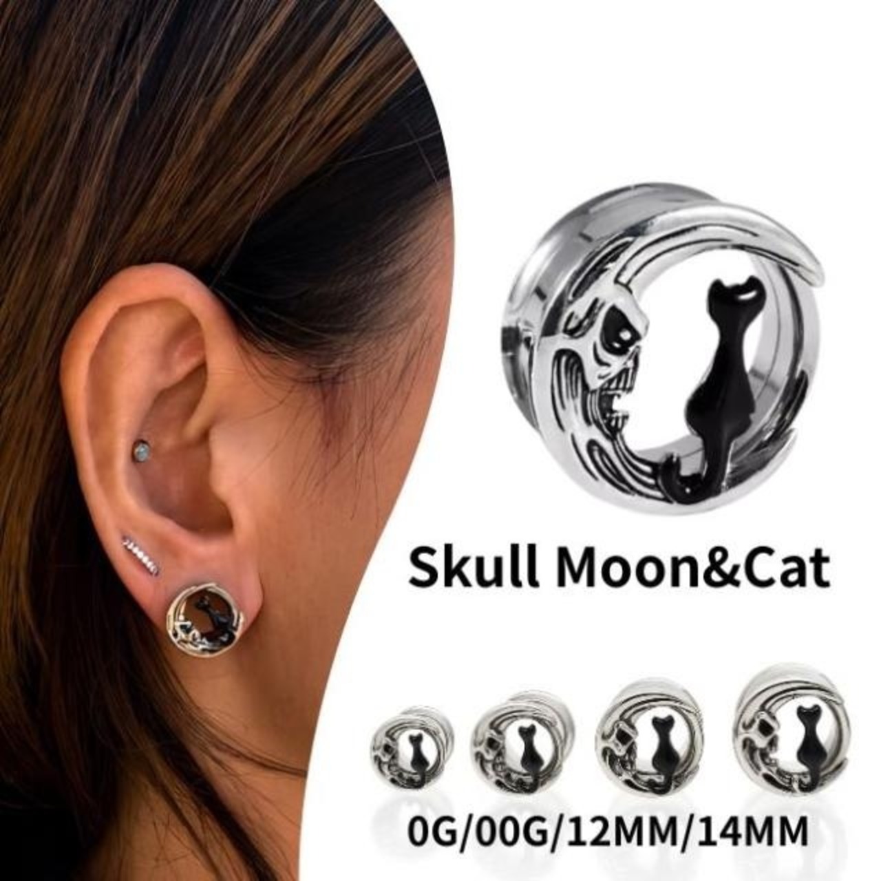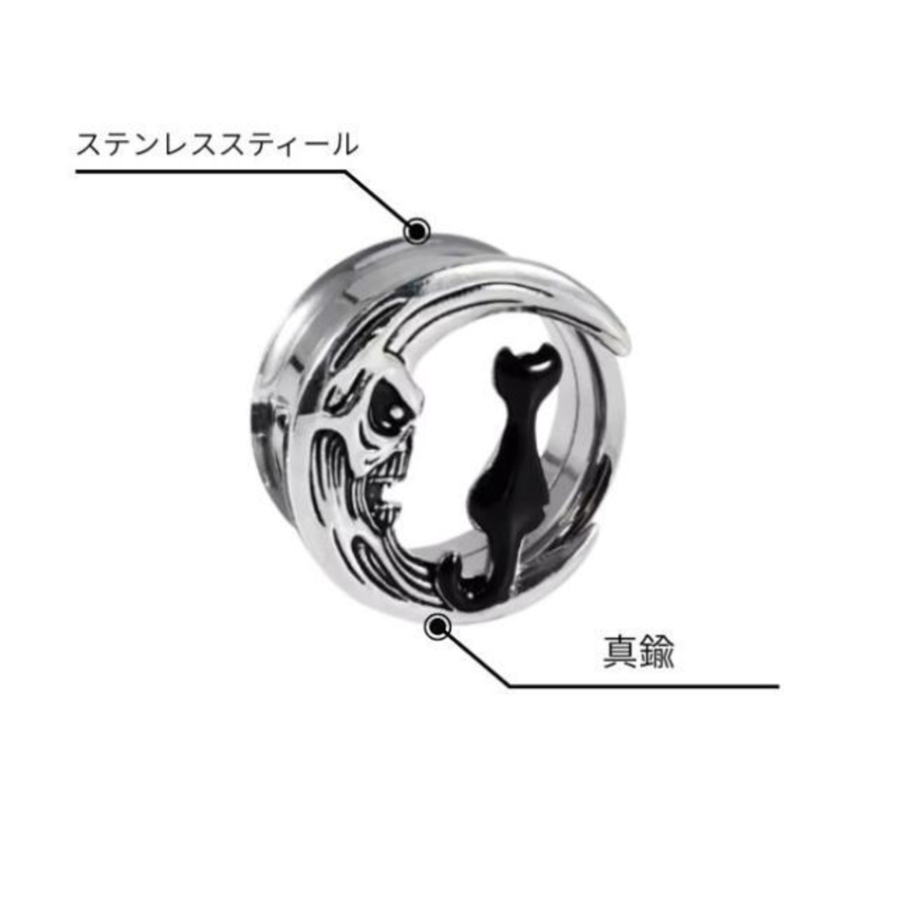 ・闇夜に浮かぶ月に、黒猫とスカルが静かに向かい合うミステリアスでアートなデザインピアスです。ステンレススチール製のベースに、三日月と黒猫を組み合わせたコントラストが魅力的な存在感を放ちます。