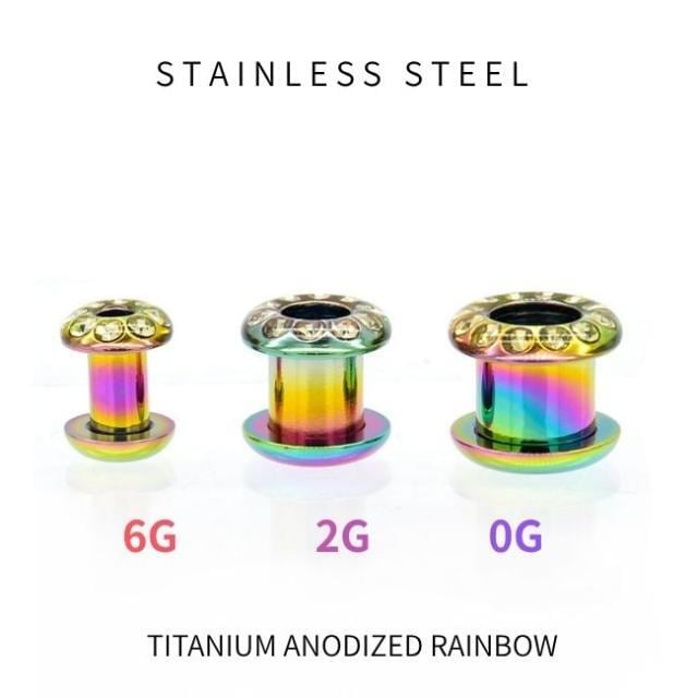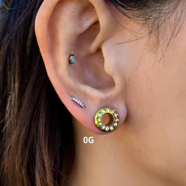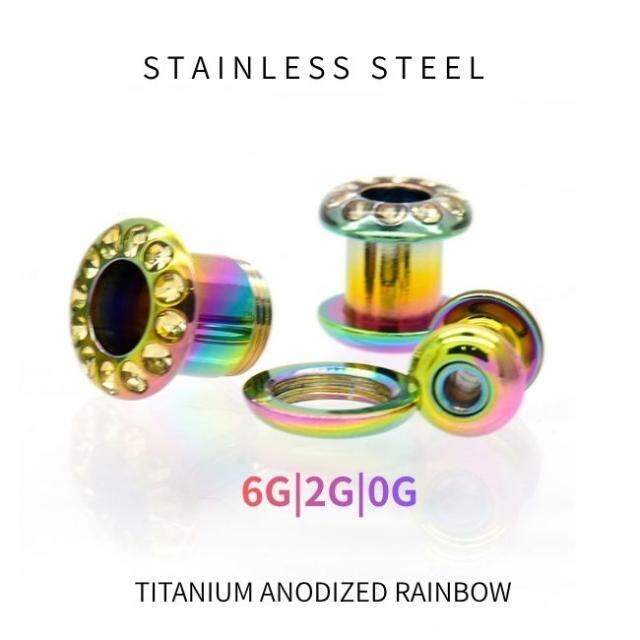 ・ステンレス素材にチタン染色を施した、光の角度によって表情が変わるレインボーカラーのトンネルピアスです。クリスタルジルコニアがキラキラ輝き華やか見た目です。ストーンはコーティングしてあるので取れにくい仕様になっております。