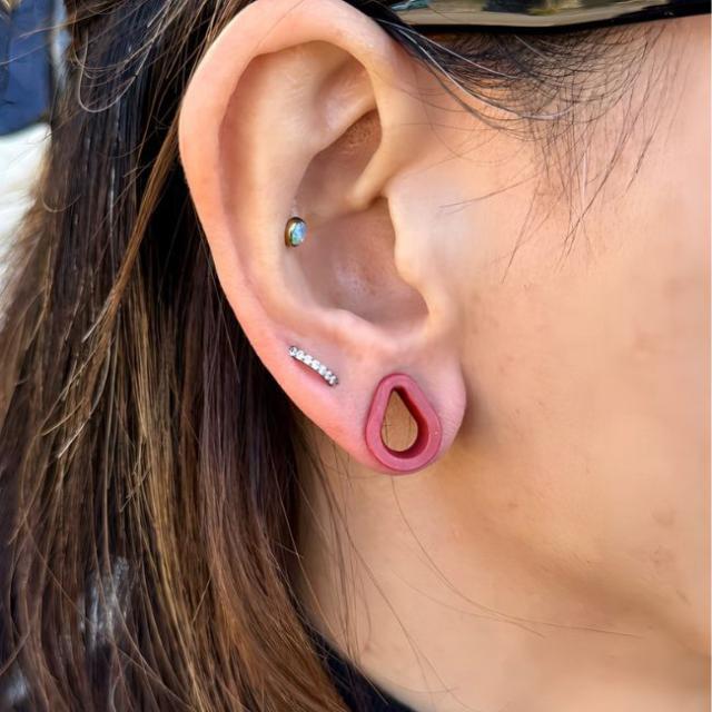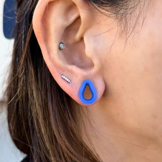 ・柔らかいシリコンでできた、穴のあいたトンネル形のボディピアスです。ダブルフレアだけど、柔らかいので畳んでホールに入れるので00Gの方が着けれます。