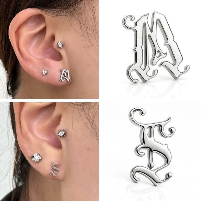 ボディピアス プッシュピアス 20G 18G 16G 14G 18G 16G old English Initial アルファベット チタンピアス 金属アレルギー対応 ラブレットスタッド 軟骨ピアス | BONshape ボディピアス専門店