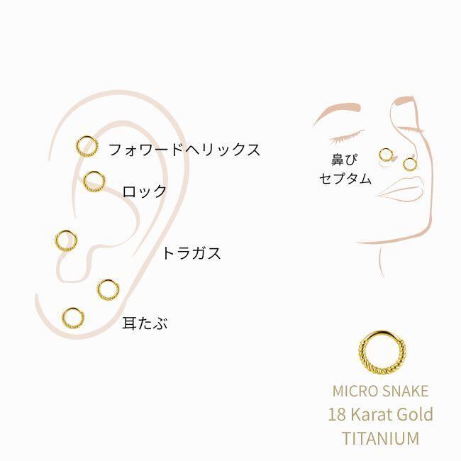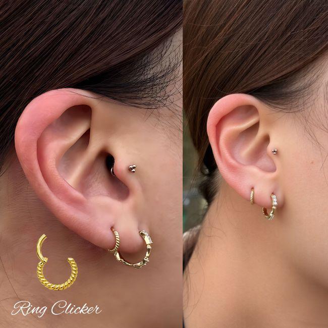 小ぶりなサイズ感なので、ロック・フォワードヘリックス・トラガス・耳たぶ・セプタム(鼻ピ)など、さまざまな部位に着用可能。
