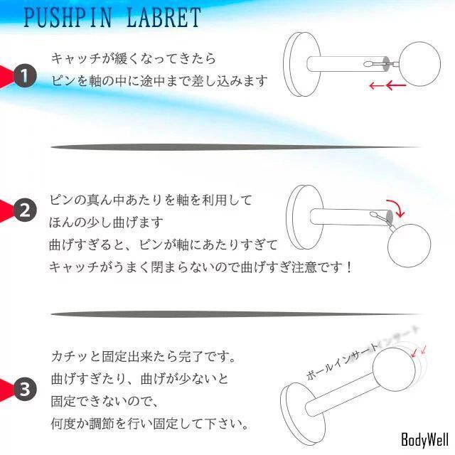 ラブレット部分にはチタン素材を採用し、肌にやさしく金属アレルギーの方にも比較的安心してご使用いただけます。※たまにキャッチが緩くなったら画像のように調節して下さい。※キャッチは専用のプッシュピンなら20/18/16/14Gどれにもはまります、着ける部位でゲージサイズが異なるときは着けたいサイズの別売りのラブレットがあれば使えます。※別売りのツールがあるとスムーズにホールに入りオススメです。