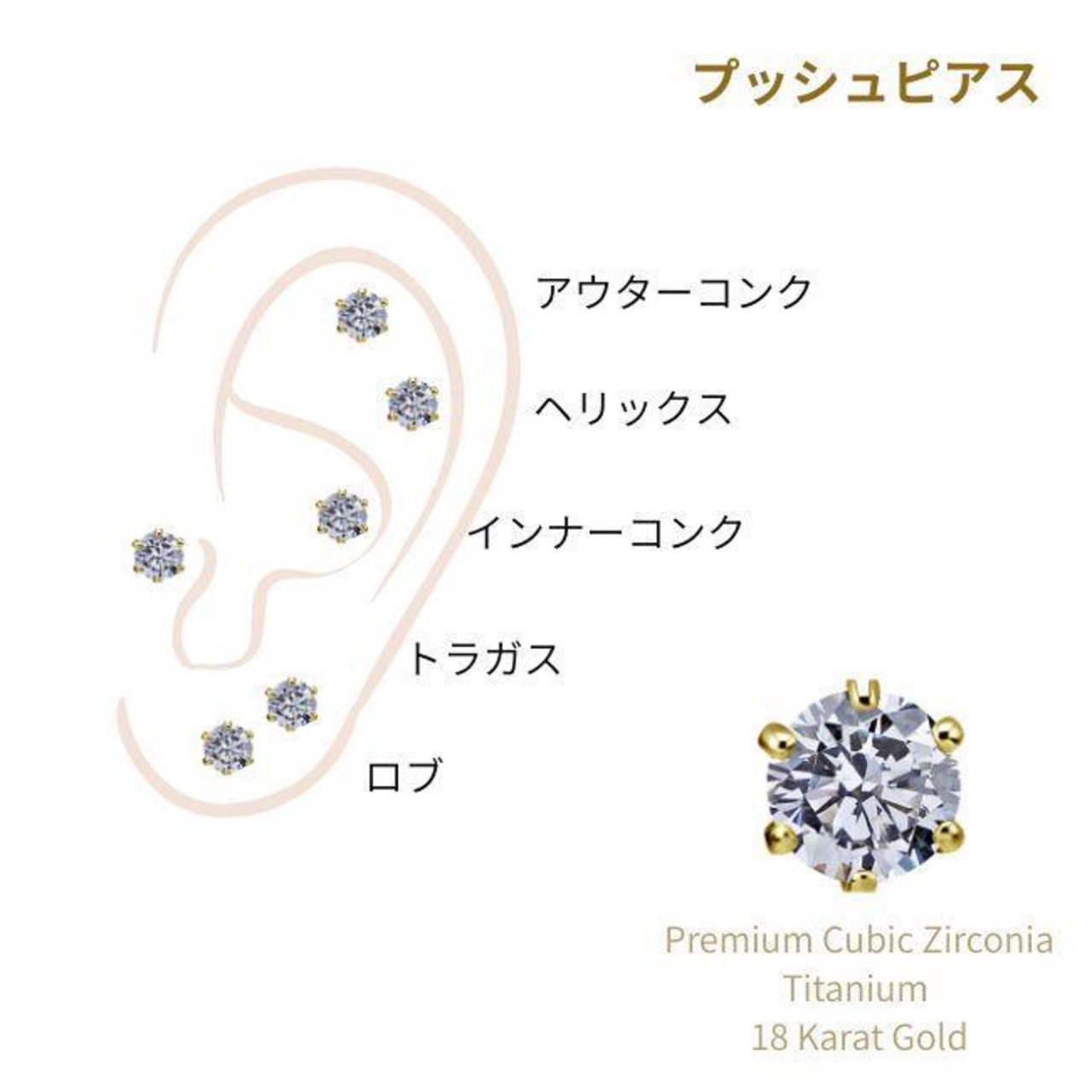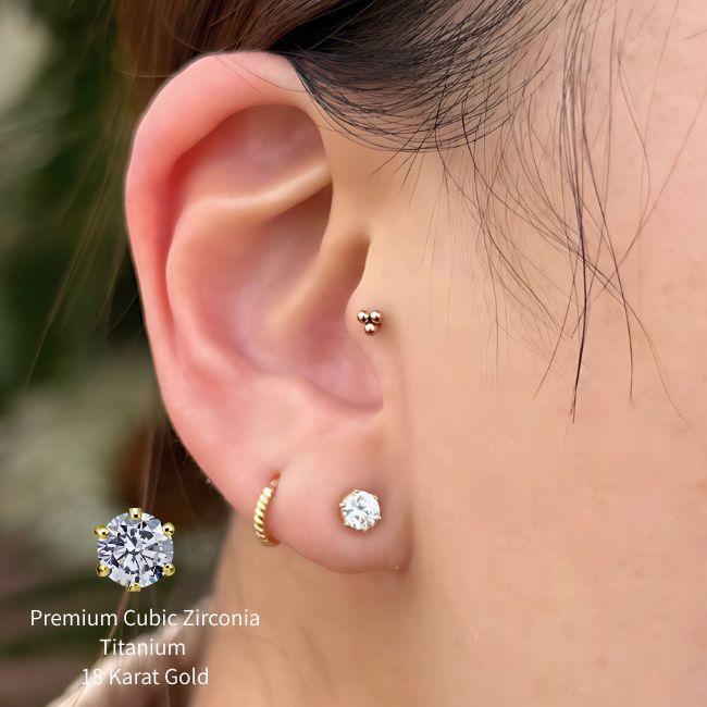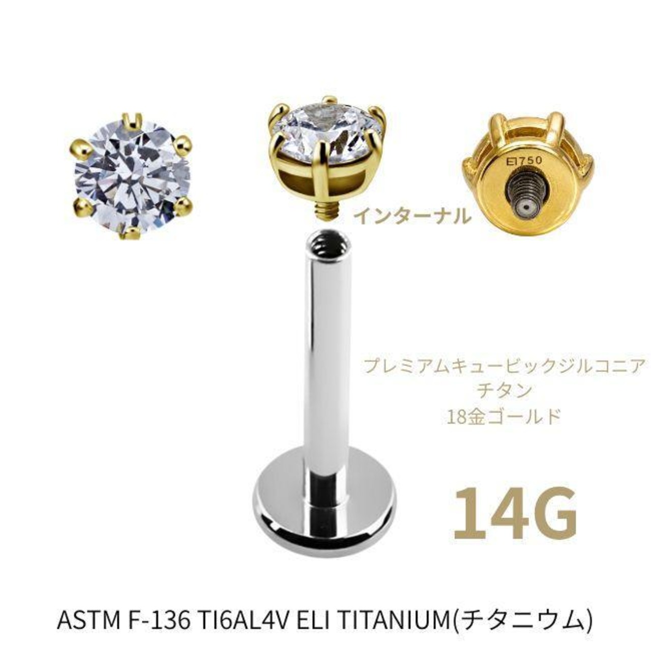 18K 18金ゴールド 立爪 14G 12G プレミアムCZ 金属アレルギー対応 チタンピアス インターナル ラブレットスタッド ボディピアス