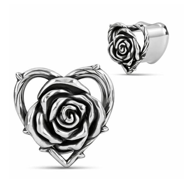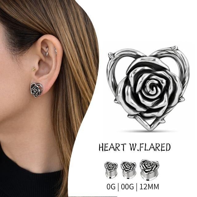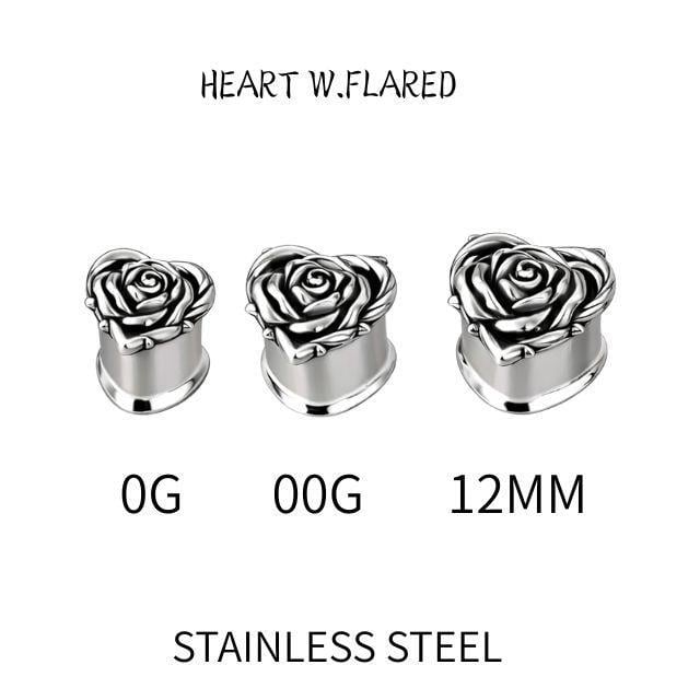 ボディピアス 0G 00G 12mm ゴシックローズ ハート ダブルフレア ステンレスピアス薔薇ピアス