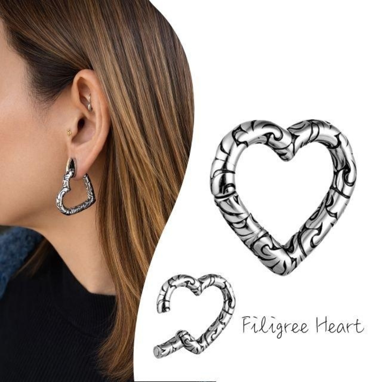 ・繊細なフィリグリー模様が刻まれた、ハート型デザインのリングピアス。
