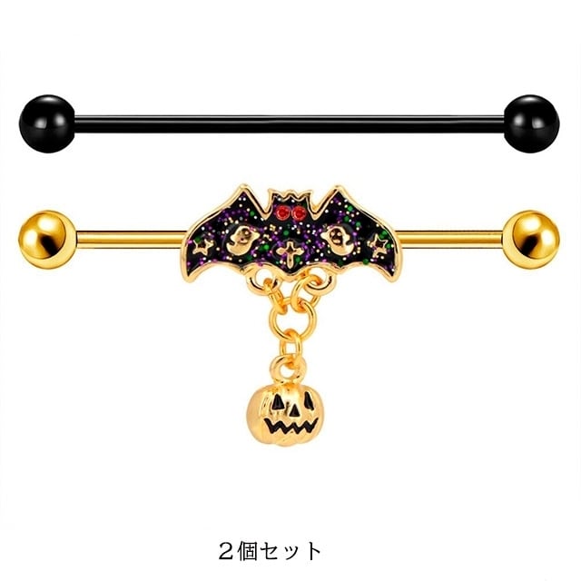 インダストリアル ピアス ボディピアス 14g 4WAY コウモリ カボチャ ゴシックピアス ブラックバーベル1本サービス ステンレスピアス つけっぱなし ロングバーベル 軟骨ピアス【ハロウィン】 | BONshape ボディピアス専門店