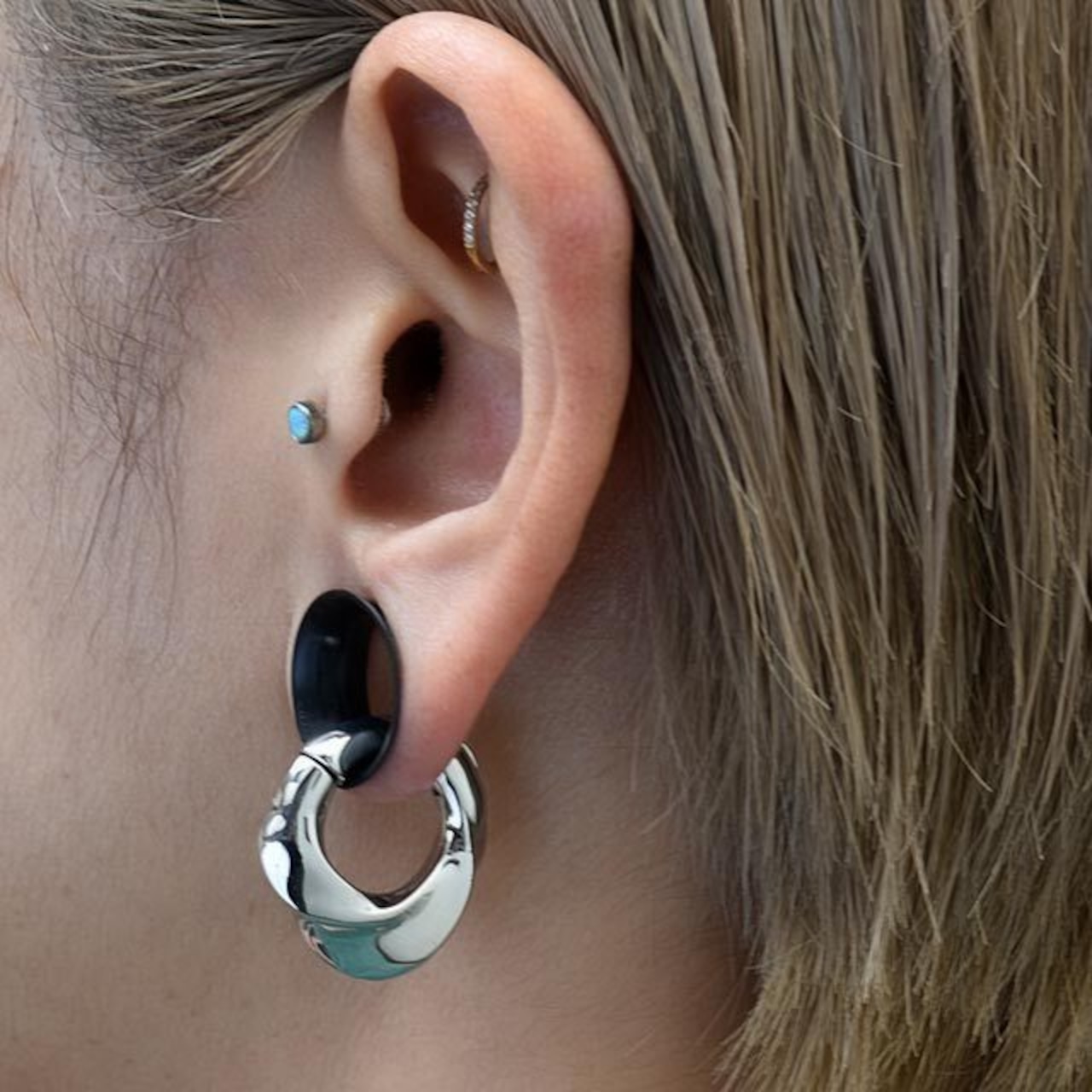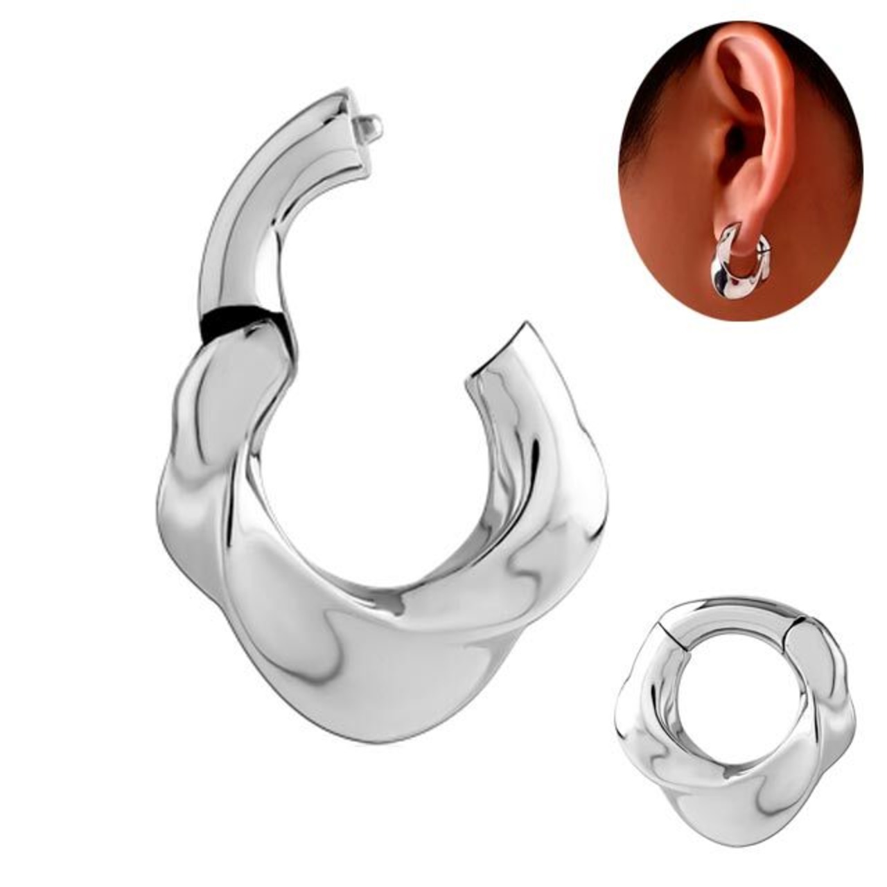 ・デザインの面が光沢があるので高級感があって華やかに見せてくれます。 開閉もカチッとワンタッチで行えるので4Gでも簡単に着けれます。※ホールに入れる時の先は4Gサイズくらいありますが真ん中は6Gくらいのサイズ感で少し小さいです、先が4Gサイズなので4Gくらいないと入りません、6Gで少しホールに余裕があると入る事もあります。 そのままのサイズの方でも使えますがトンネルピアスにリングを通してホールトゥーもお勧めです。 お出かけにワンタッチで簡単に着けれるリングピアスでイメチェンコーデしませんか!?