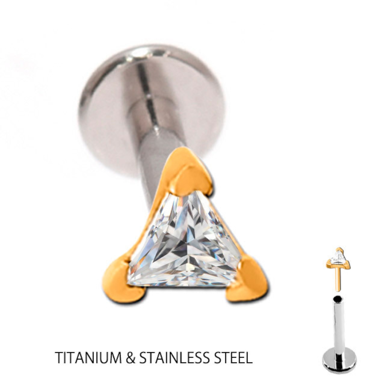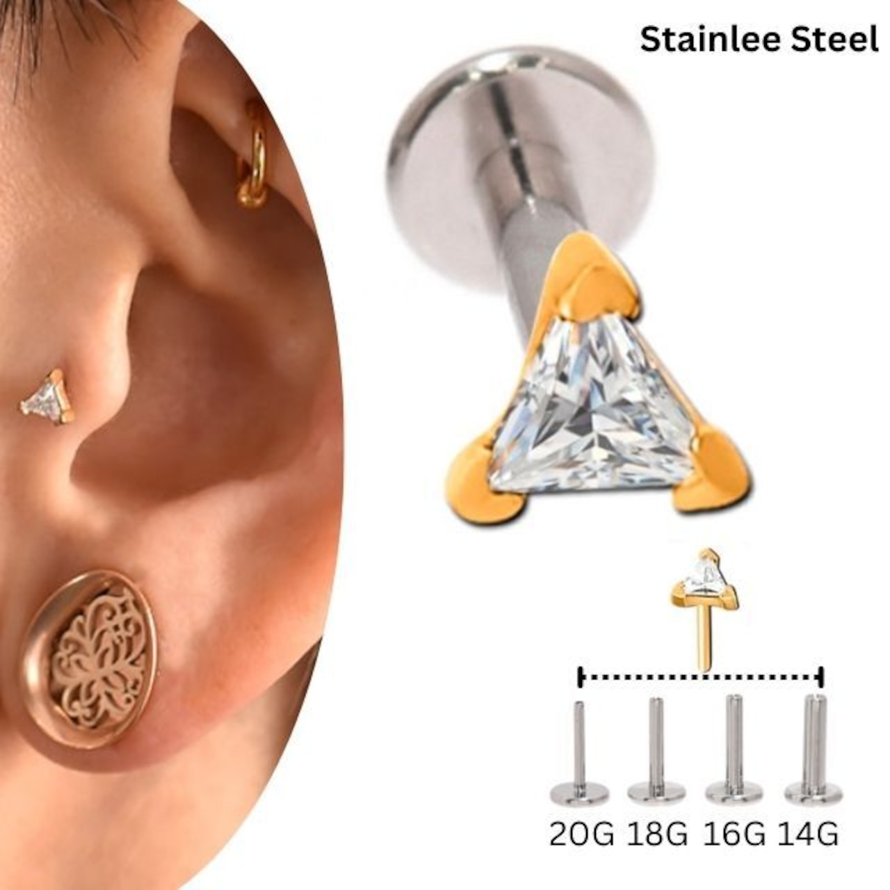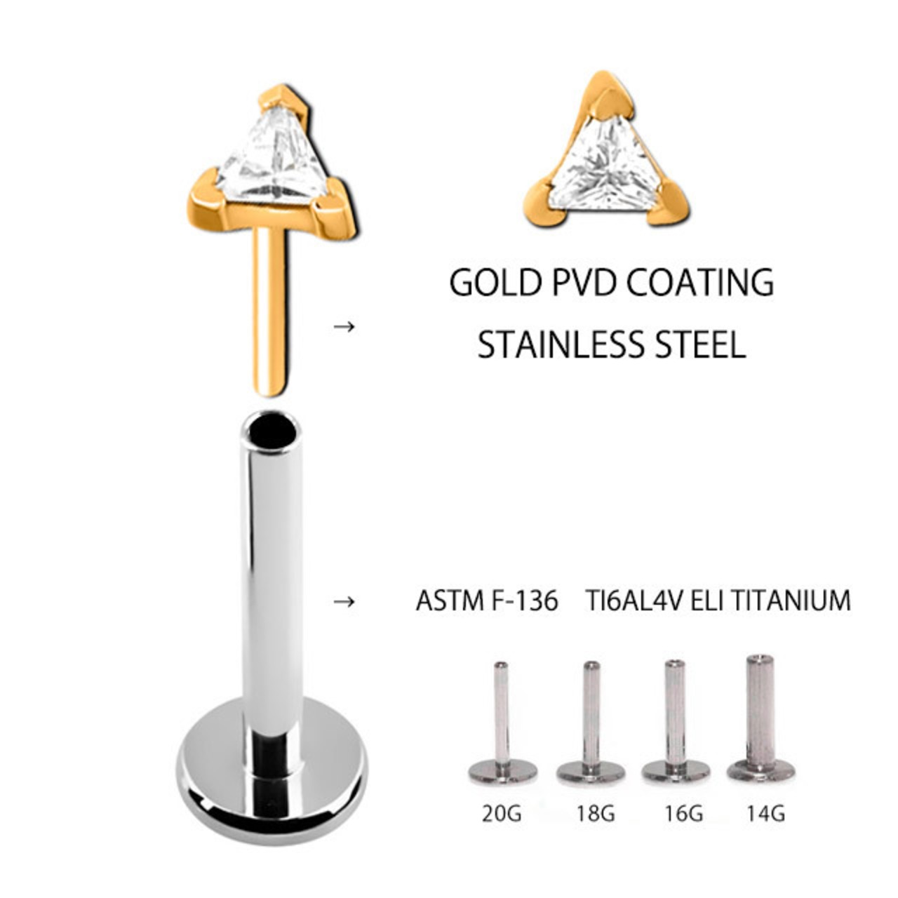 ・トライアングルデザインは、大人っぽく決まります。ゴールドにクリスタルジルコニアがマッチして綺麗ですよ。 何と言っても装着が挿すだけの簡単プッシュピアスタイプなのでネイルされている方や不器用な方にもオススメです。また、同じキャッチでも20G/18G/16G/14Gのどのサイズにもはまります、たまに着ける部位のサイズが違うときはラブレットのみ交換すれば着けれます。※たまにキャッチが緩くなったら画像のように調節して下さい。※ラブレットの下のフラットなディスク部分は入荷時期によりサイズが異なります予めご了承ください。 オススメ部位/ロブ トラガスピアス ヘリックスピアス 軟骨ピアス インナーコンク アウターコンク