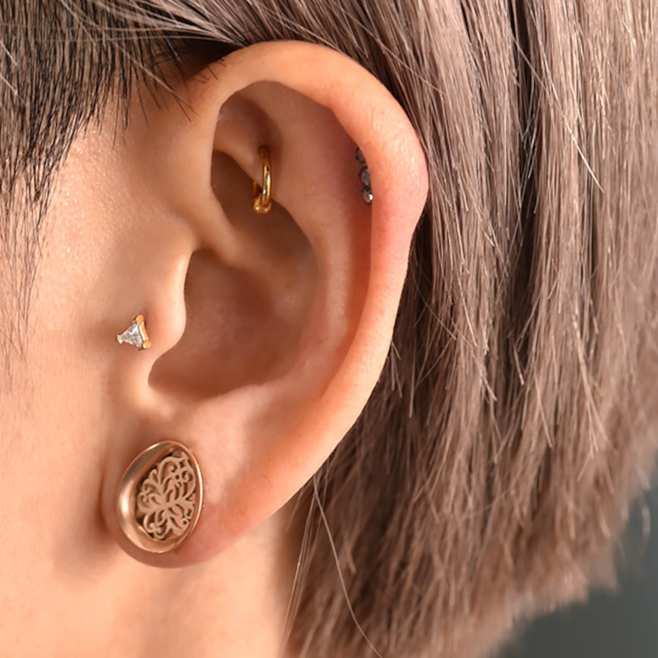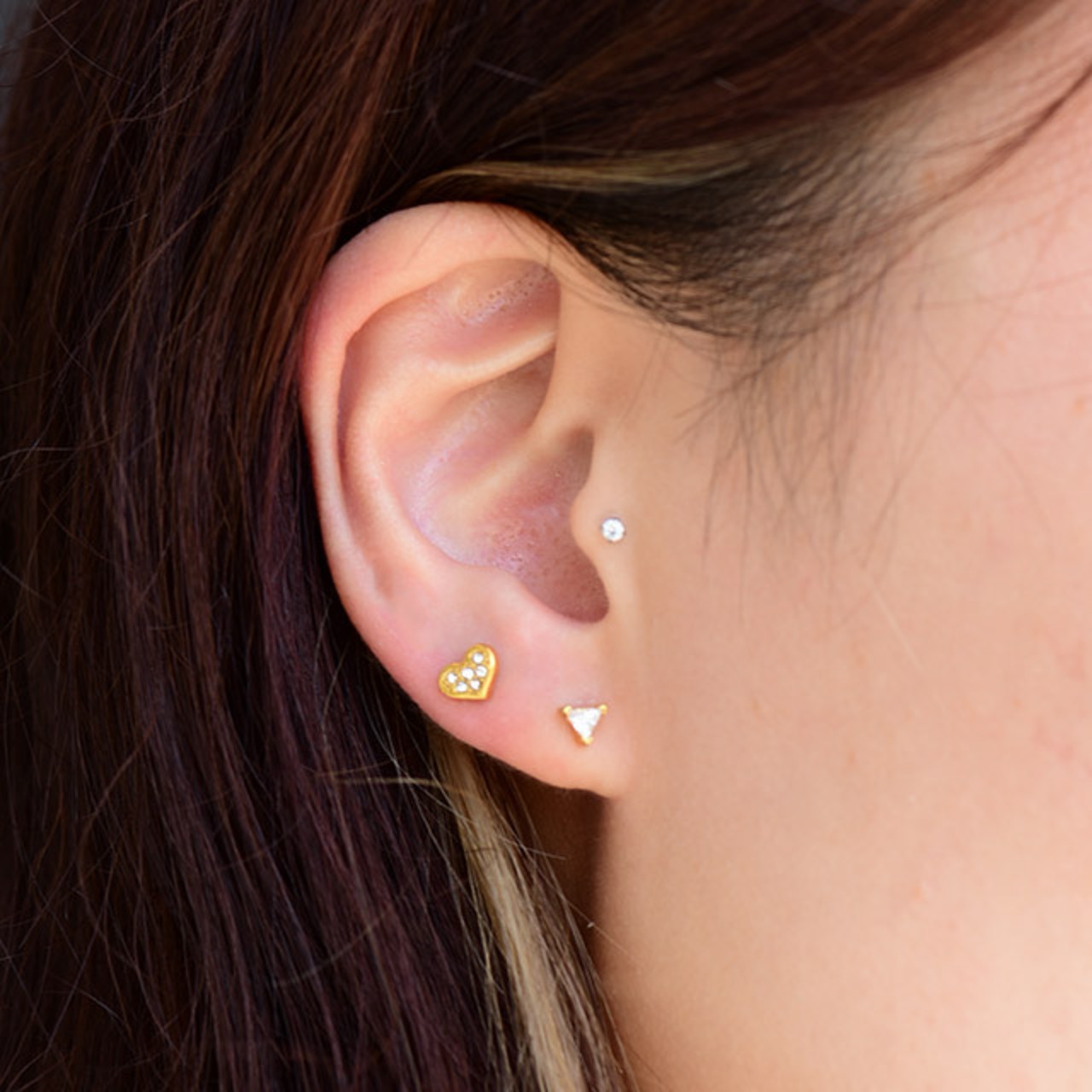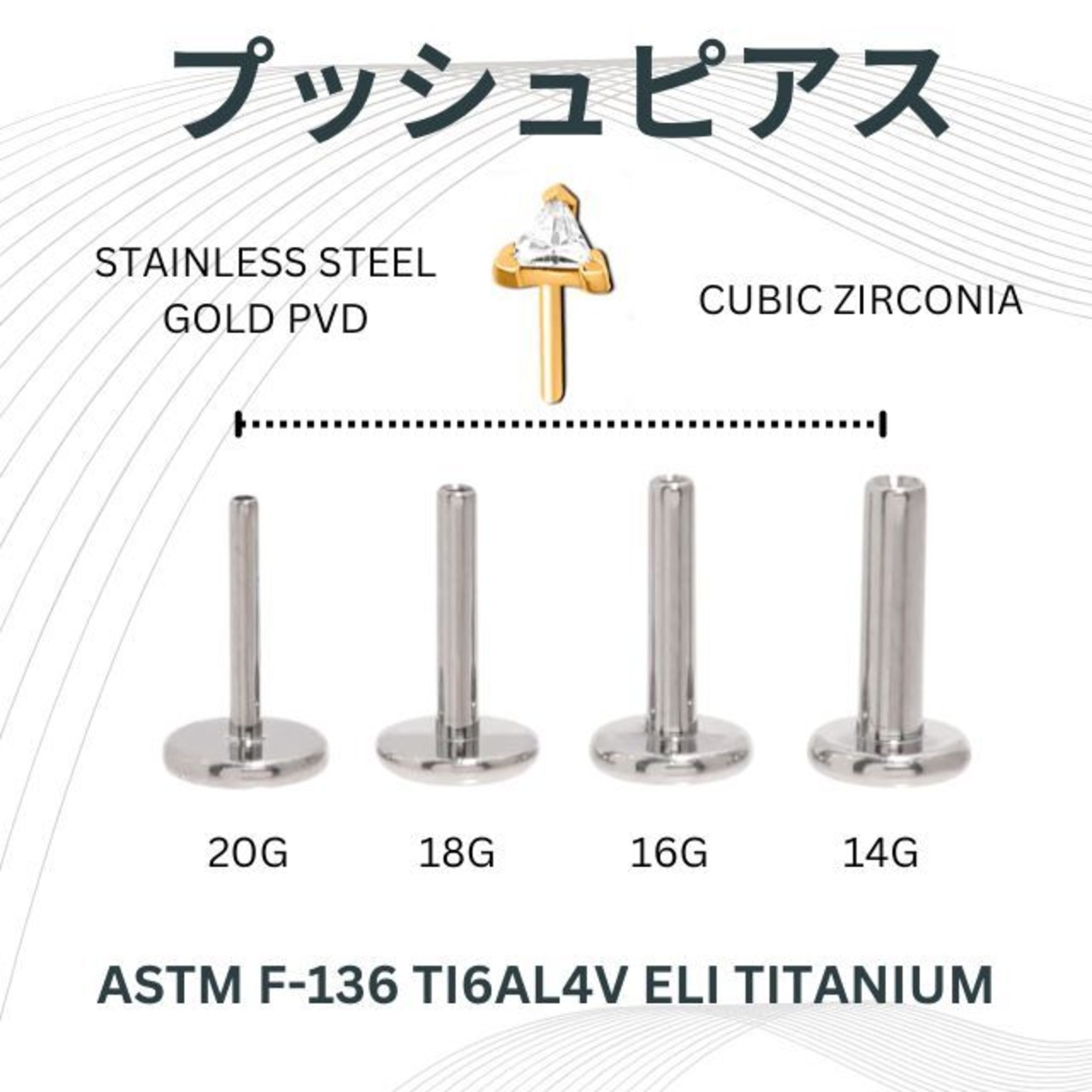 ・トライアングルデザインは、大人っぽく決まります。ゴールドにクリスタルジルコニアがマッチして綺麗ですよ。 何と言っても装着が挿すだけの簡単プッシュピアスタイプなのでネイルされている方や不器用な方にもオススメです。また、同じキャッチでも20G/18G/16G/14Gのどのサイズにもはまります、たまに着ける部位のサイズが違うときはラブレットのみ交換すれば着けれます。※たまにキャッチが緩くなったら画像のように調節して下さい。※ラブレットの下のフラットなディスク部分は入荷時期によりサイズが異なります予めご了承ください。 オススメ部位/ロブ トラガスピアス ヘリックスピアス 軟骨ピアス インナーコンク アウターコンク