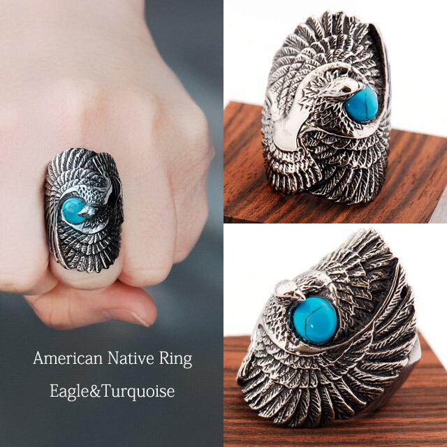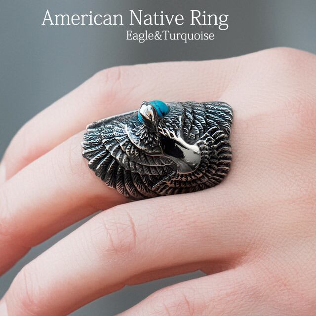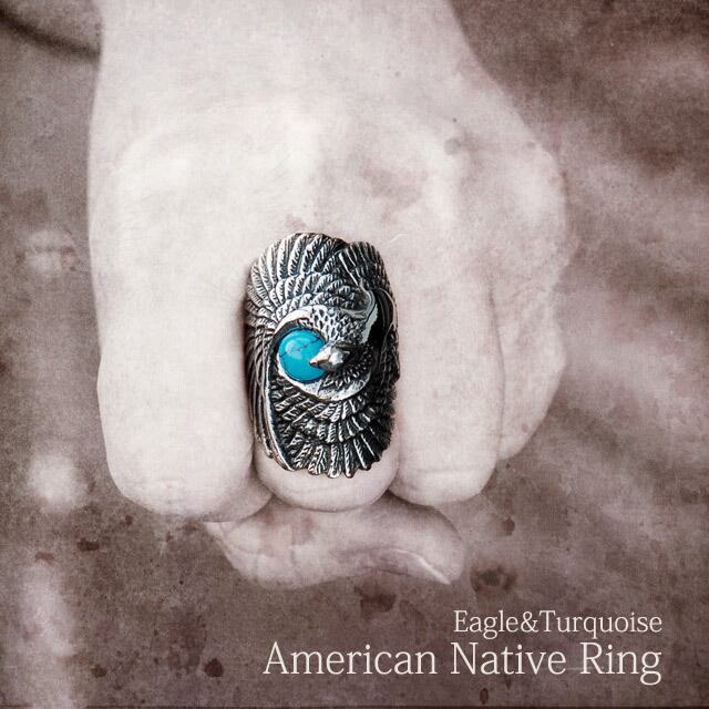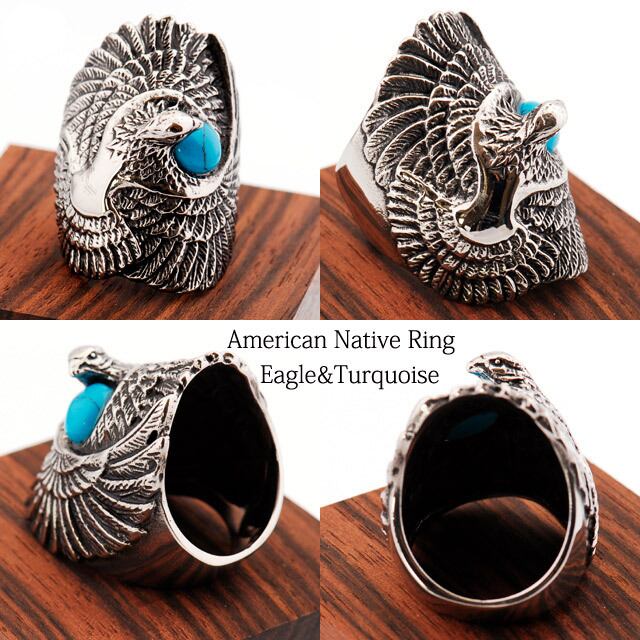 ・ごつめの迫力満点の指輪です。指の第一関節を覆うようにデザインされたイーグルがインパクトあり!!ターコイズがアクセントになり、これ1つでコーディネイトが華やかにかっこよく決まりますょ。