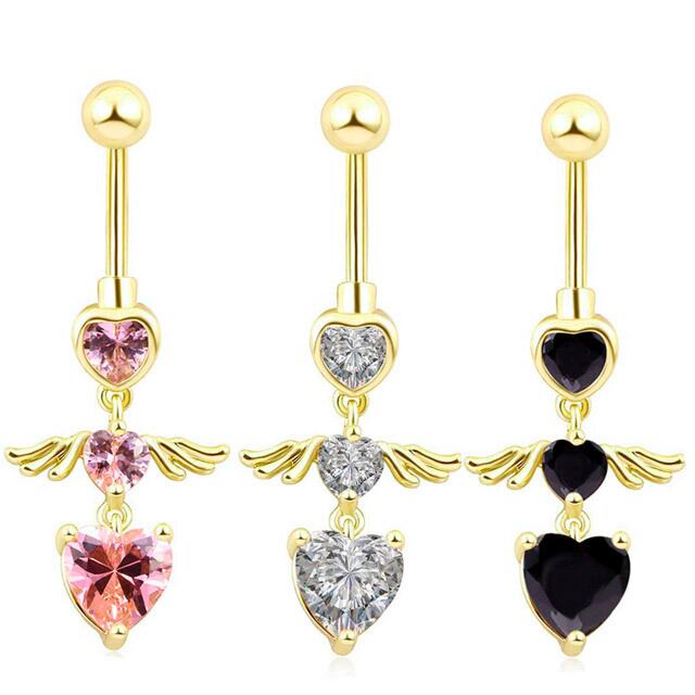 ・真ん中のハートには羽根が付き、ゆらゆら揺れて可愛いですよ!ゴールドカラーとジルコニアの輝きが華やかです。女性らしくかわいいピンク、いろんなコーデに合わせやすく上品なクリア、高級感ある大人なブラックの3色から選べます。へそピアスにはもちろん、揺れるので耳たぶに着けても可愛くおすすめです。