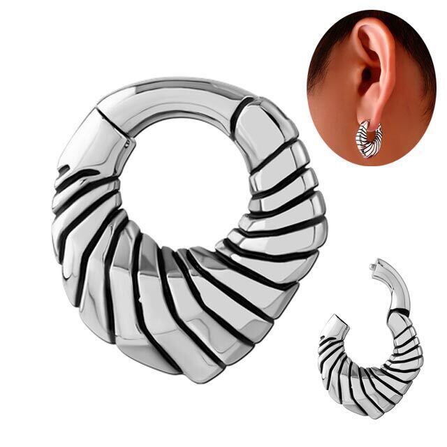 ・細かくラインが入りラインがブラックカラーなので大人かっこいいデザインです。これ一つでインパクトあってテンションがあがりますよ。 開閉もカチッとワンタッチで行えるので4Gでも簡単に着けれます。※ホールに入れる時の先は4Gサイズくらいありますが真ん中は6Gくらいのサイズ感で少し小さいです、先が4Gサイズなので4Gくらいないと入りません、6Gで少しホールに余裕があると入る事もあります。 そのままのサイズの方でも使えますがトンネルピアスにリングを通してホールトゥーもお勧めです。 お出かけにワンタッチで簡単に着けれるリングピアスでイメチェンコーデしませんか!?