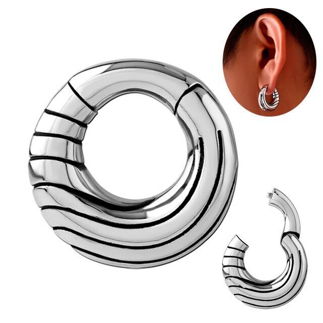 ・波のようなライン入りのリングは派手過ぎずシンプルだけどラインが入る事でグッとオシャレに!正面、横、後ろで全然異なる模様が素敵です。大人っぽいデザインでユニセックスでお使いいただけます。これ一つでインパクトあってテンションがあがりますよ。 そのままのサイズの方でも使えますがトンネルピアスにリングを通してホールトゥーもお勧めです。 開閉もカチッとワンタッチで行えるので4Gでも簡単に着けれます。※ホールに入れる時の先は4Gサイズくらいありますが真ん中は6Gくらいのサイズ感で少し小さいです、先が4Gサイズなので4Gくらいないと入りません、6Gで少しホールに余裕があると入る事もあります。お出かけにワンタッチで簡単に着けれるリングピアスでイメチェンコーデしませんか!?