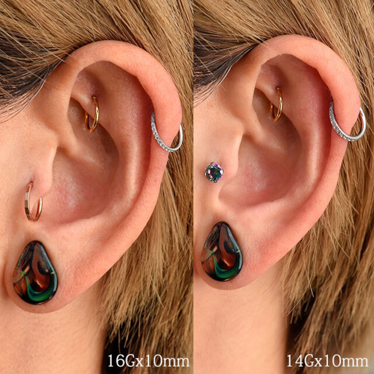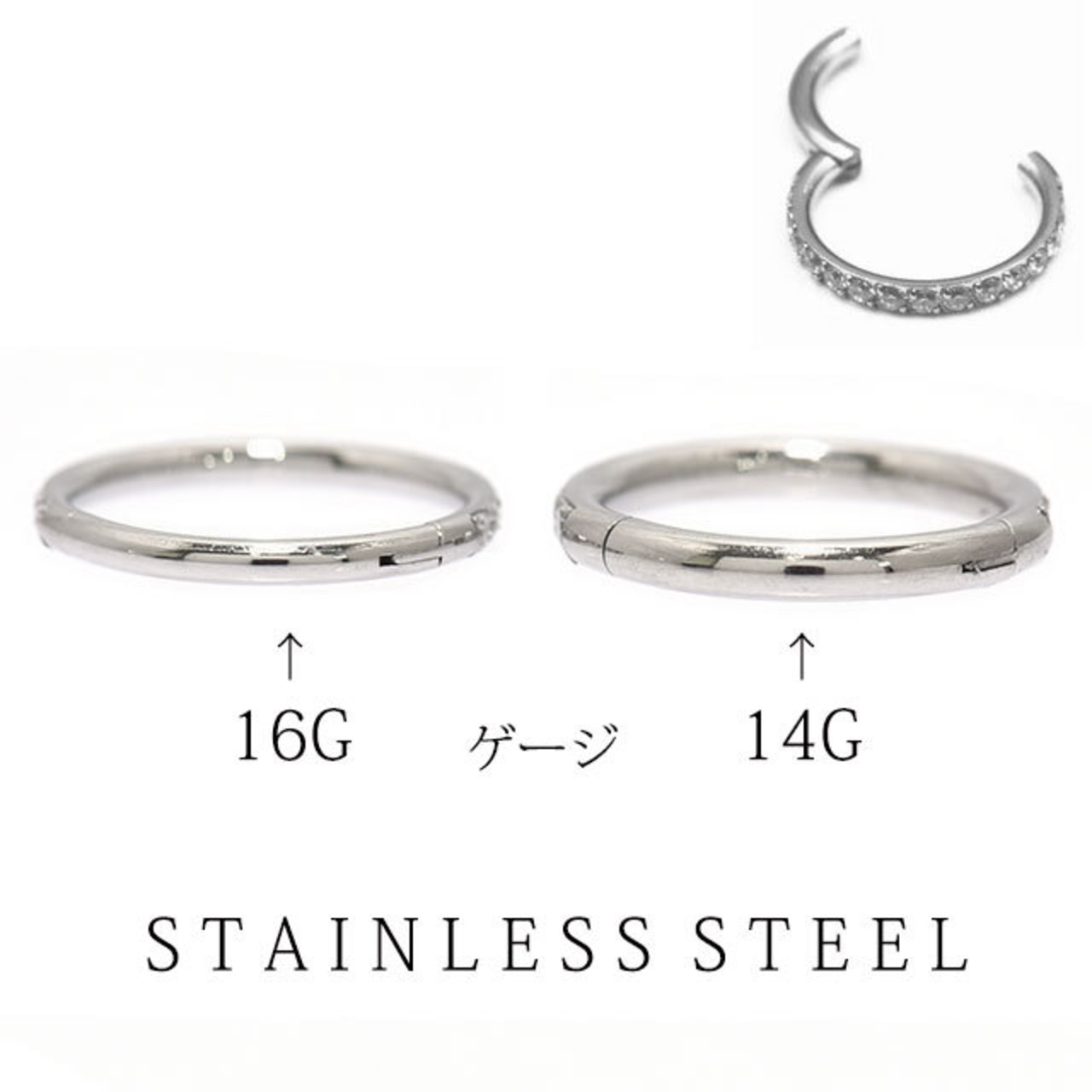 ・クリスタルジルコニアが贅沢に16Gには19個、14Gには15個セットされています。 前後どちらからでもストーンの輝きが分かります。 ストーン自体は小さいですがそれぞれが輝き高級感あふれる仕上がりに。 カチッとワンタッチで装着できるのでストレスなくお使いいただけます。 イヤーロブや、ヘリックス、インナーコンクなど軟骨ピアスにもオススメです。 ステンレス素材なのでお肌にも優しいです。