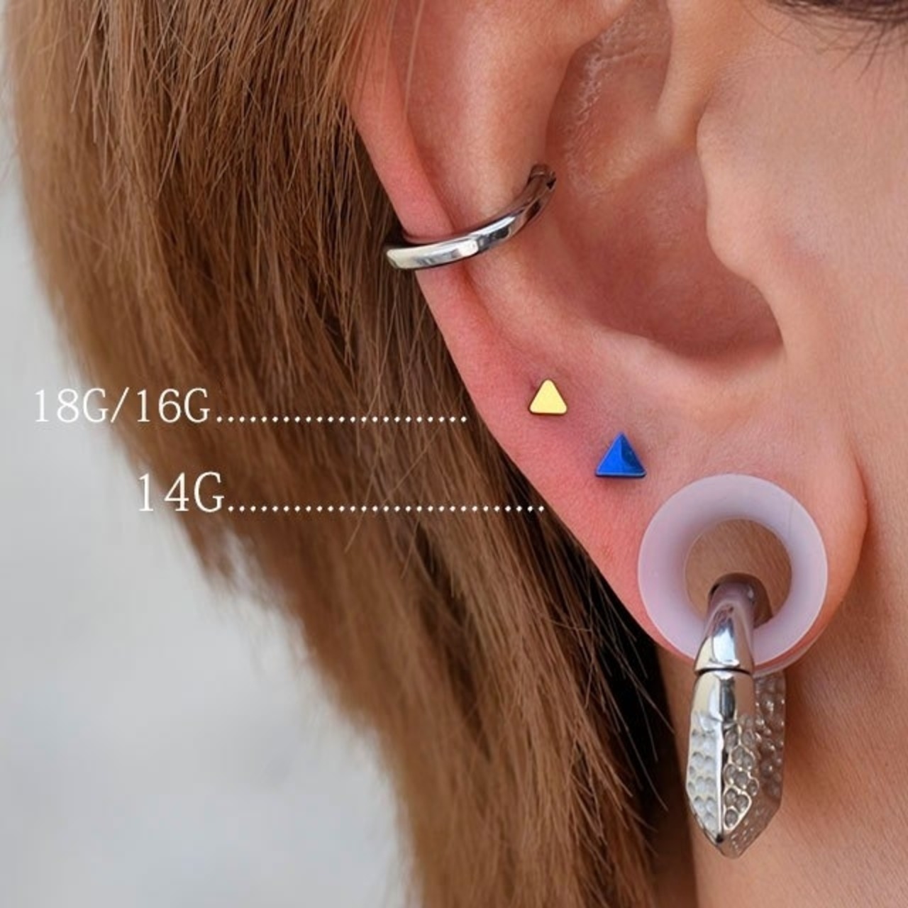 ・トライアングルの形がオシャレで可愛く決まります。全3色カラーでお好きな色が選べます。パーツもラブレットも医療用タイタニアム(チタン)で丈夫で軽く相当なアレルギーでない限りアレルギーの方でも安心してお使い頂けます。イヤーロブやヘリックス、トラガス、アウターコンク、アンチトラガスなど軟骨ピアス、マイクロダーマルにもオススメです。※18Gと16Gのネジは同じです、ラブレットの下のディスクサイズは入荷時期により大きさが異なります予めご了承下さい。※ラブレットサイズは選択にないサイズもある場合があります、ご希望の方は一度お問合せ下さい。