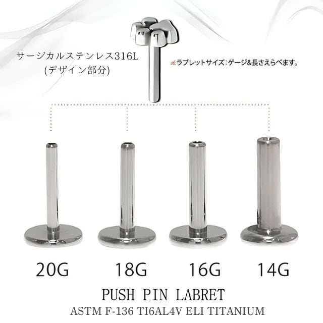 ・ぷにっと思わず触りたくなるような肉球デザインがとってもキュート。ラブレットの長さが選べるのでロブやヘリックス、インナーコンク、アウターコンク、トラガスなど軟骨ピアス等の部位にオススメです。何と言っても装着が挿すだけの簡単プッシュピアスタイプなのでネイルされている方や不器用な方にもオススメです。ラブレットはチタン素材なのでお肌にも優しく金属アレルギーの方でも比較的安心して使えます。※たまにキャッチが緩くなったら画像のように調節して下さい。※キャッチは専用のプッシュピアスなら20G/18G/16G/14Gどれにもはまります、着ける部位でゲージサイズが異なるときは着けたいサイズのラブレットがあれば使えます。 ※ラブレットの下のフラットなディスク部分は入荷時期によりサイズが異なります予めご了承ください。