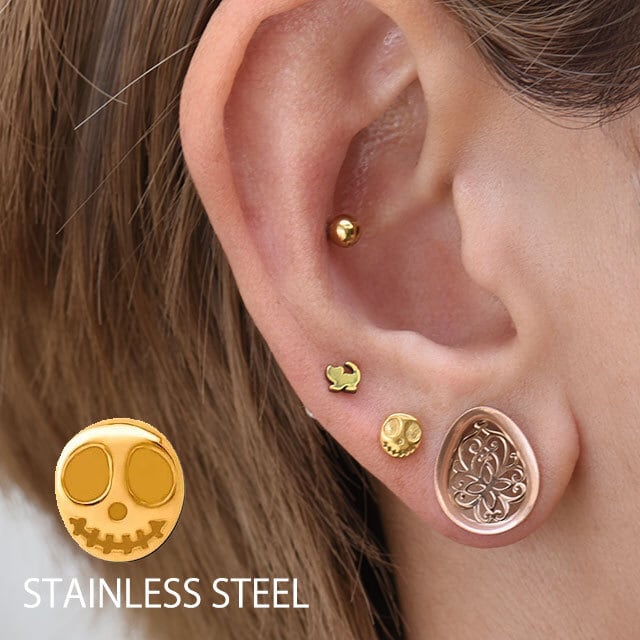 10G 8G 6G ゴールド スカルフェイス ラブレットスタッド 舌ピアス 軟骨ピアス ロブ インナーコンク ボディピアス ステンレスピアス