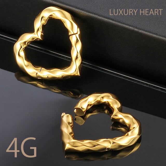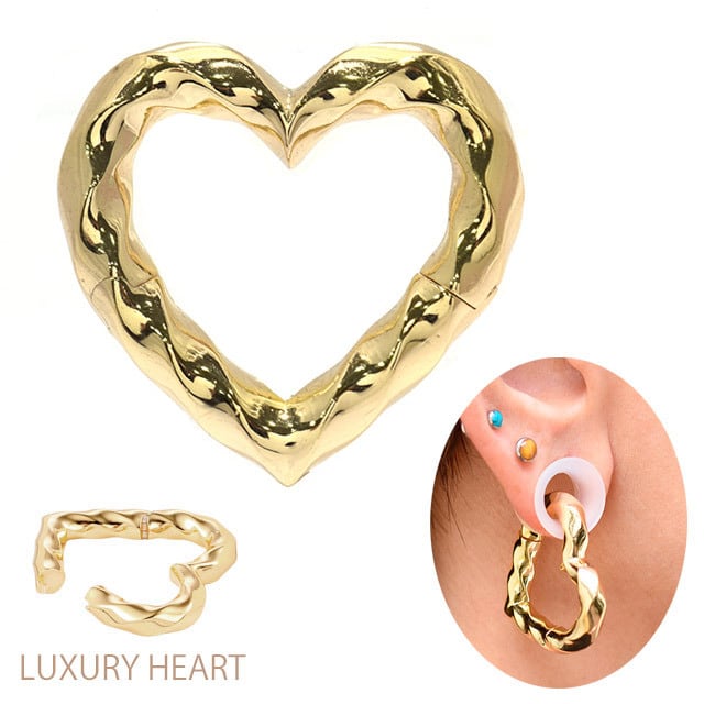 ・可愛いハートピアスです。 ねじりデザインなのでオシャレで角度で光沢が出て高級感あります。 クリッカータイプなのでカチッとワンタッチで開閉出来るので4Gサイズでも手で簡単に着けれます。 そのままのサイズで使用も出来ますがトンネルにホールトゥもオススメです(トンネルの長さにもよりますが0G~のトンネルに入ります) ※仕様上、開閉部に少し隙間があるのでカタカタ少し音が鳴ります、予めご了承下さい。