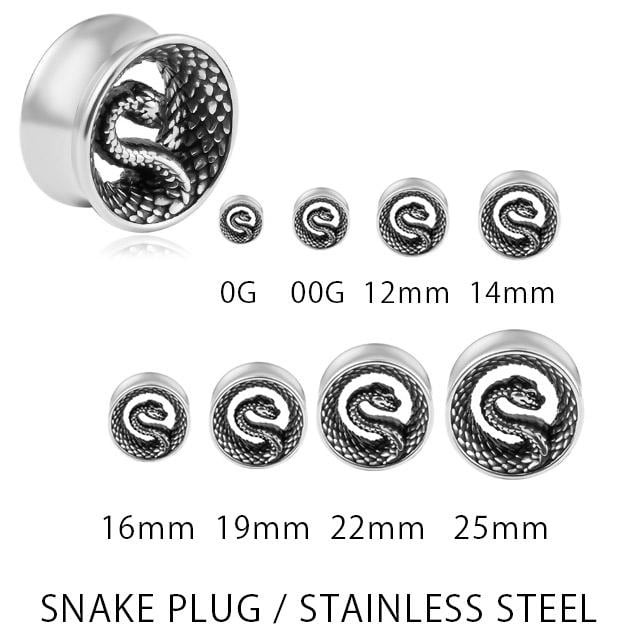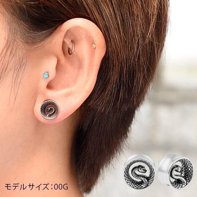 ・人気シリーズ、スネイクピアスは円状に蛇の鱗が広がりかっこいいです。 裏面も同じデザイン入りなので後ろから見ても楽しめます。 ※キャッチが無いダブルフレアピアスです、フレア部分はゲージサイズより約2mm程大きいです。ホールに隙間がない方や伸びにくい方は1ゲージ下のサイズをお勧めします。