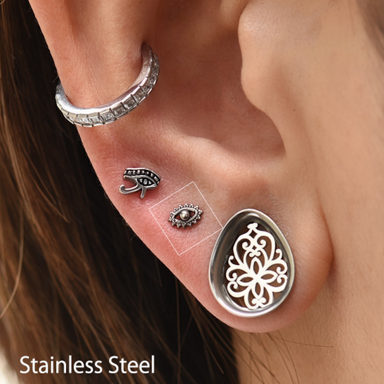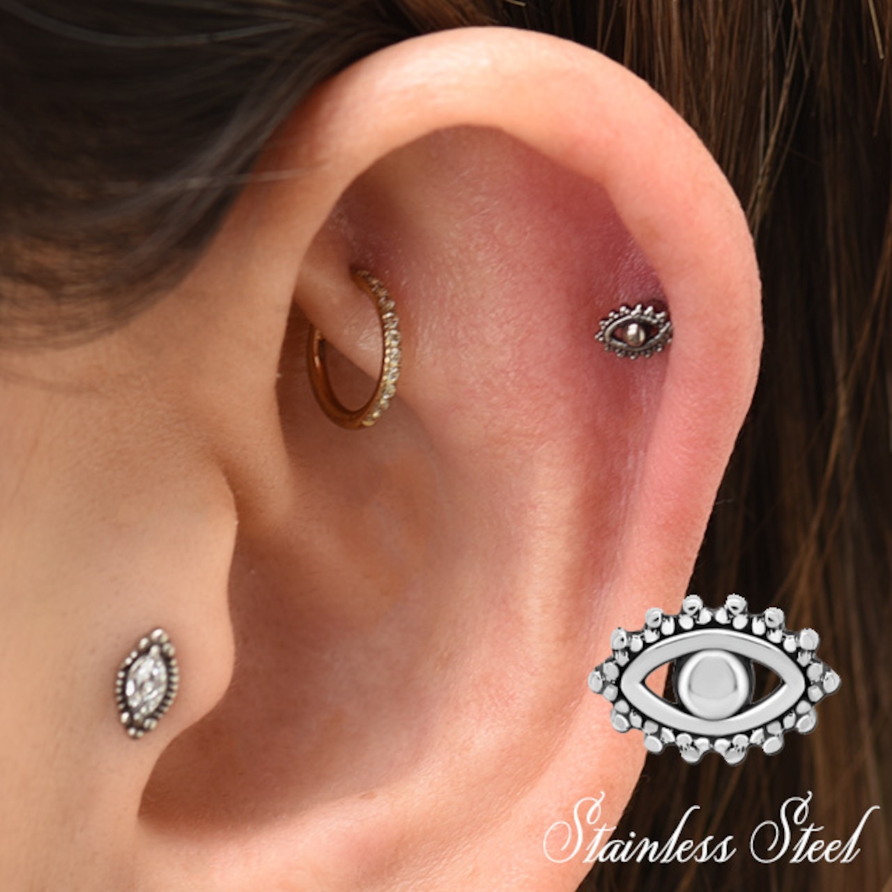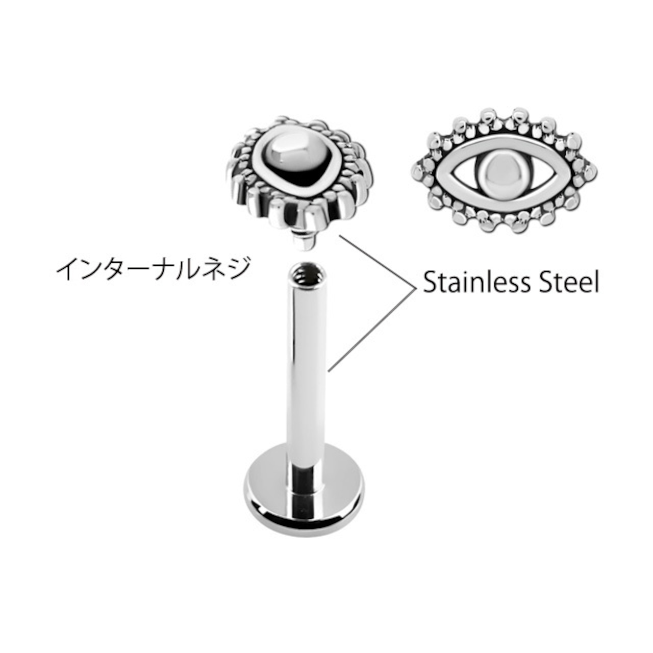 ・目のデザインピアスは小さくても細かいデザインで大きすぎないのでいろんな部位に着けれます。 ロブやトラガス、ヘリックス、アウターコンク、インナーコンク、アンチトラガスなど軟骨ピアスにもお勧めです。 ※ラブレットのディスクサイズはメーカーの入荷時期によりばらつきがあります、あらかじめご了承下さい。 インターナルネジタイプでキャッチにネジ山があります。