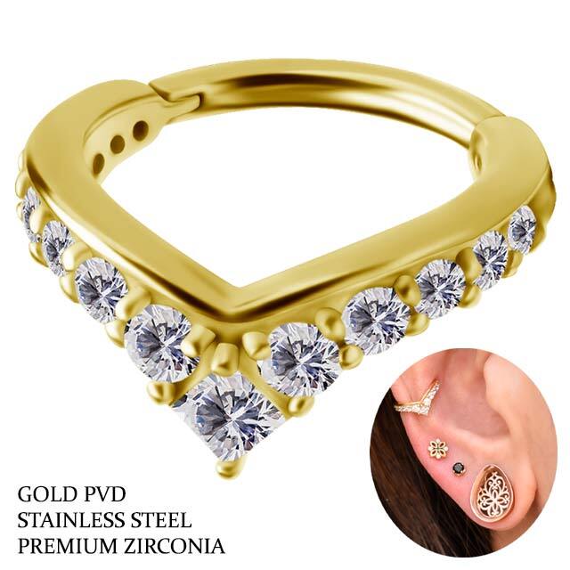 ステンレスピアス 16G ゴールド ティアラ プレミアムジルコニア ワンタッチで装着 セグメントリング クリッカー 軟骨ピアス へリックス インナーコンク ボディピアス | BONshape ボディピアス専門店