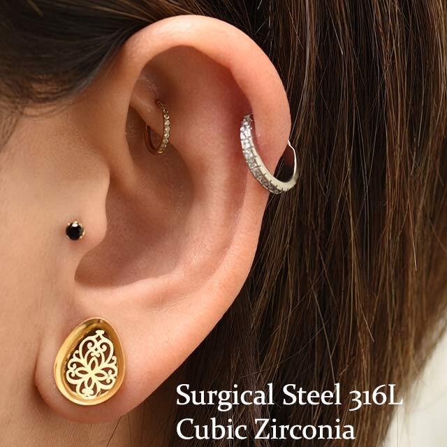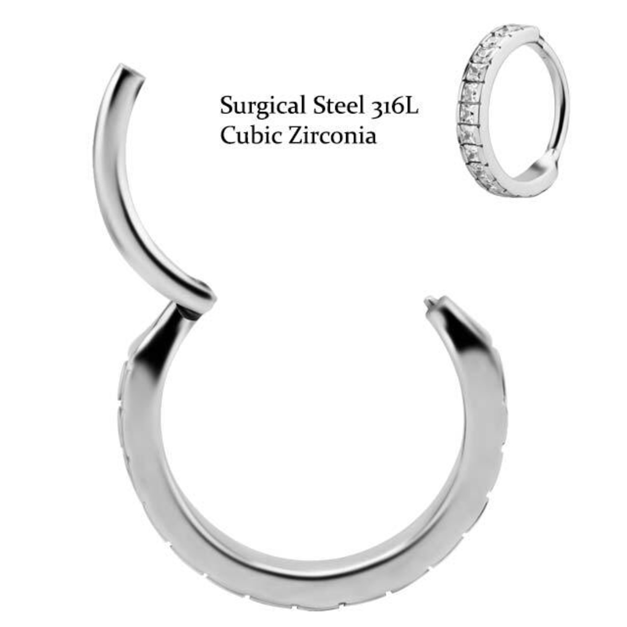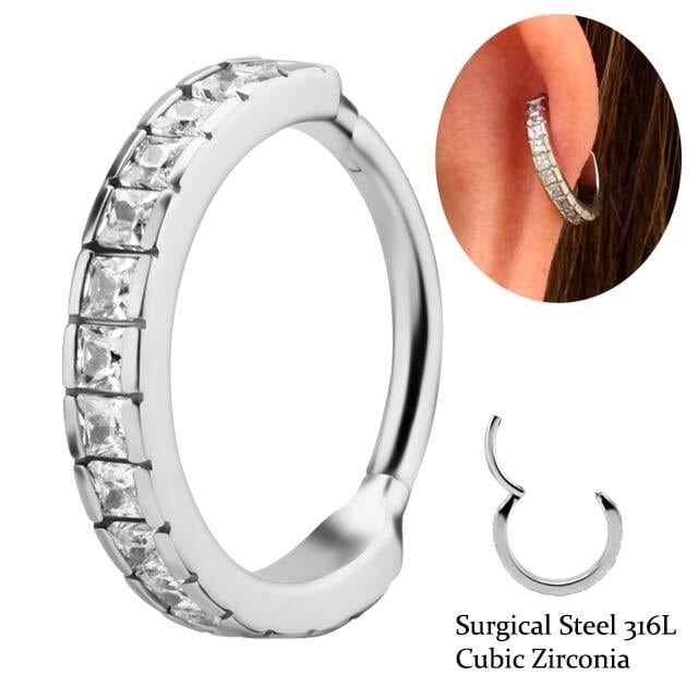 ・スクエア型のクリスタルジルコニアがとても綺麗です。17個ものストーンが付いているのでどこから見ても輝きがあり高級感あり。カチッとワンタッチで簡単に開閉出来るので着脱も楽ですよ。内径サイズも12mmなのでインナーコンクにオススメです。ロブやヘリックスなどの軟骨ピアスにも。