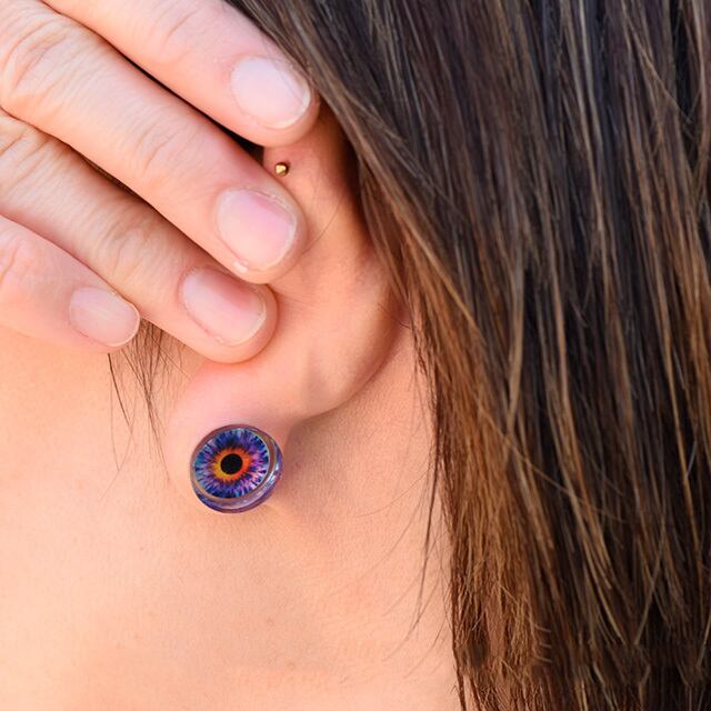・中に目のデザインが入った綺麗なピアスです。角度でキラキラ感が増すので目のデザインを主張しすぎずオシャレなピアスです。アクリル素材なのでとても軽くホールの負担が少ないです。※フレアピアスなのでホールサイズよりも少し大きめです、フレアサイズくらいないと入りません、ホールに隙間がない方や伸びにくい方はワンサイズ下をお選び下さい。 ※装着画像は14mmです、参考にして下さい。