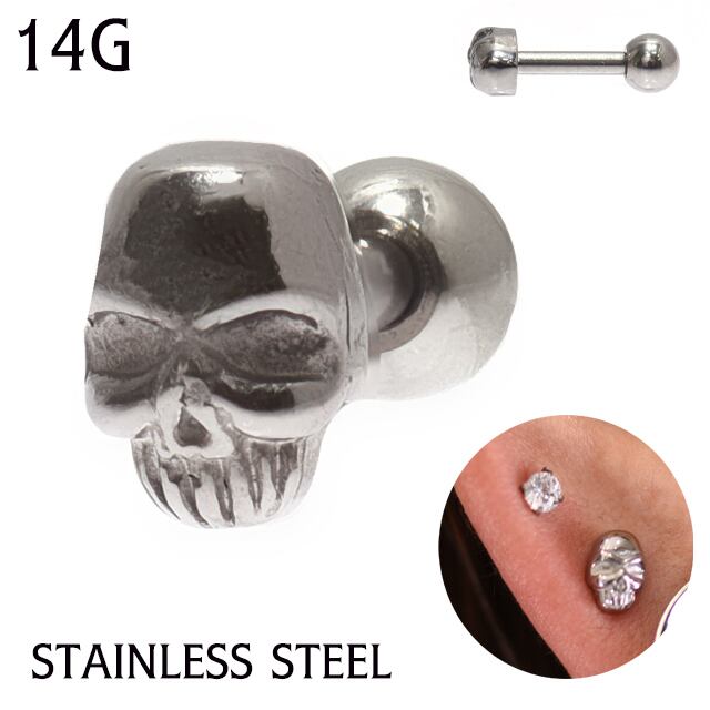 ・人気のスカルデザインです。スカルはかっこよく決まりますよ!シャフトサイズもボールサイズも選択できるのでロブやヘリックス、インナーコンク、アウターコンク、トラガス、舌ピアス等などにも色んな部位に着けれます。※ロブや軟骨の平均シャフトサイズは5~6mm、舌ピアスの平均サイズは12mm~14mmです。ご自身のホールの厚みでお選び下さい。あくまでも平均サイズなので参考までに。※画像のボールサイズは4mmです、大きめ希望な5mmボールを選択してください。