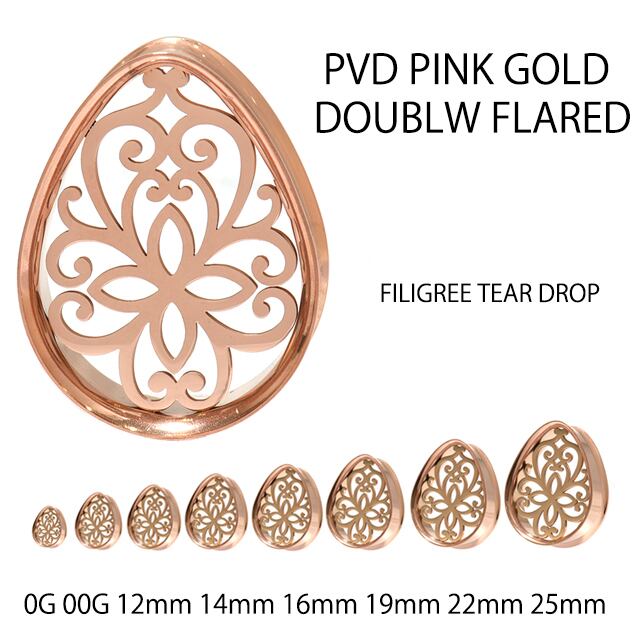 ・当店人気のフィリグリーデザインです。ピンクゴールドカラーなので可愛く上品に決まります。ピンクゴールドカラーは日本人の肌に馴染むのでカラーピアスが初めての方でも挑戦しやすくオススメです。ティアドロップの形ですごくオシャレ。ハイポリッシュ仕上げなので光沢があって高級感あります。フレアピアスですが丸ではないので普通のダブルフレアよりも入りやすいです。※耳の装着画像ピアスはサイズ14mmです。